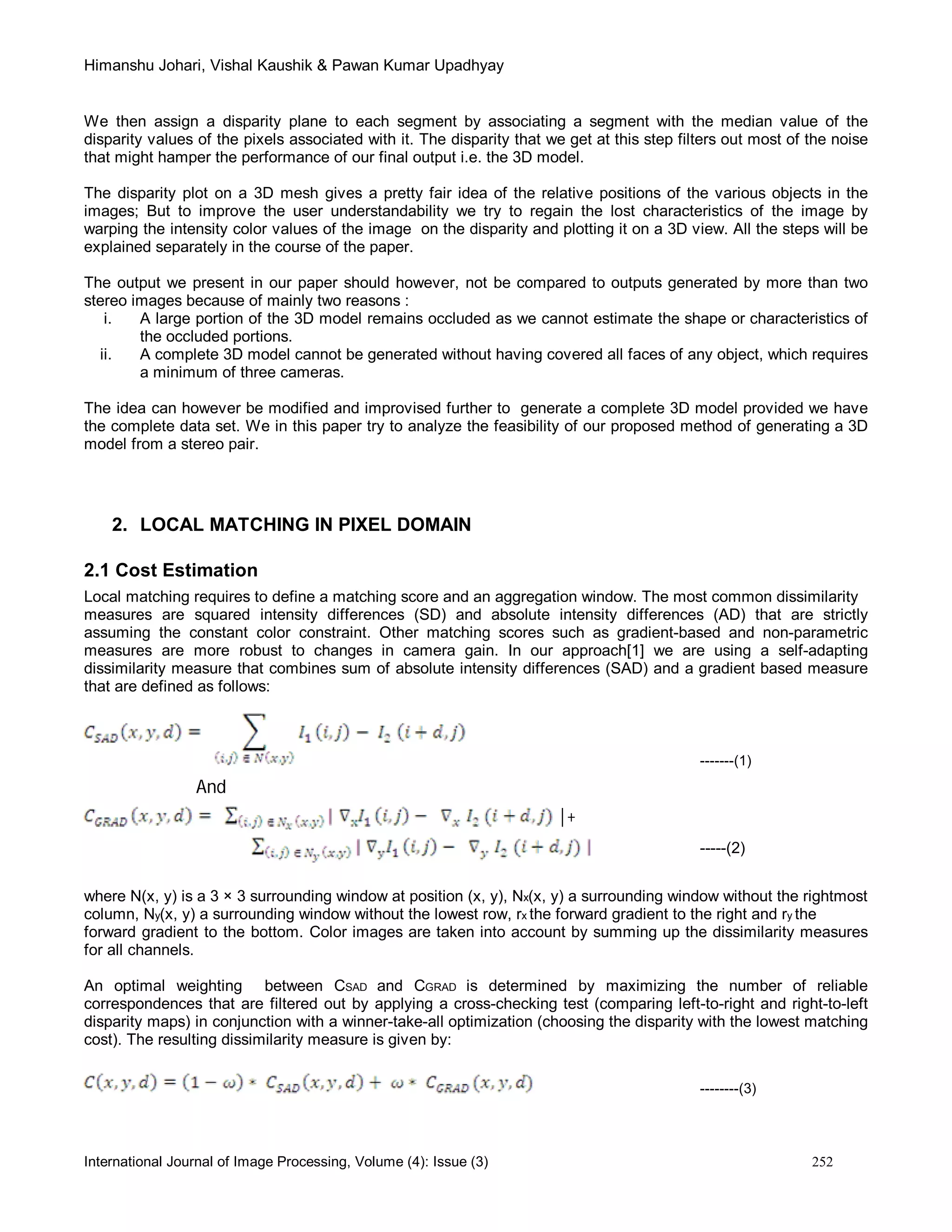The document presents a method for developing a 3D viewing model from a pair of 2D stereo images by implementing local matching techniques to calculate horizontal disparities and occlusion ratios. It discusses challenges in disparity estimation and describes a novel approach that includes image segmentation, noise reduction, and depth calculation to enhance the quality of the final 3D model output. The results show effective transformations of stereo images into 3D models, with measured occlusion ratios for various test cases.
