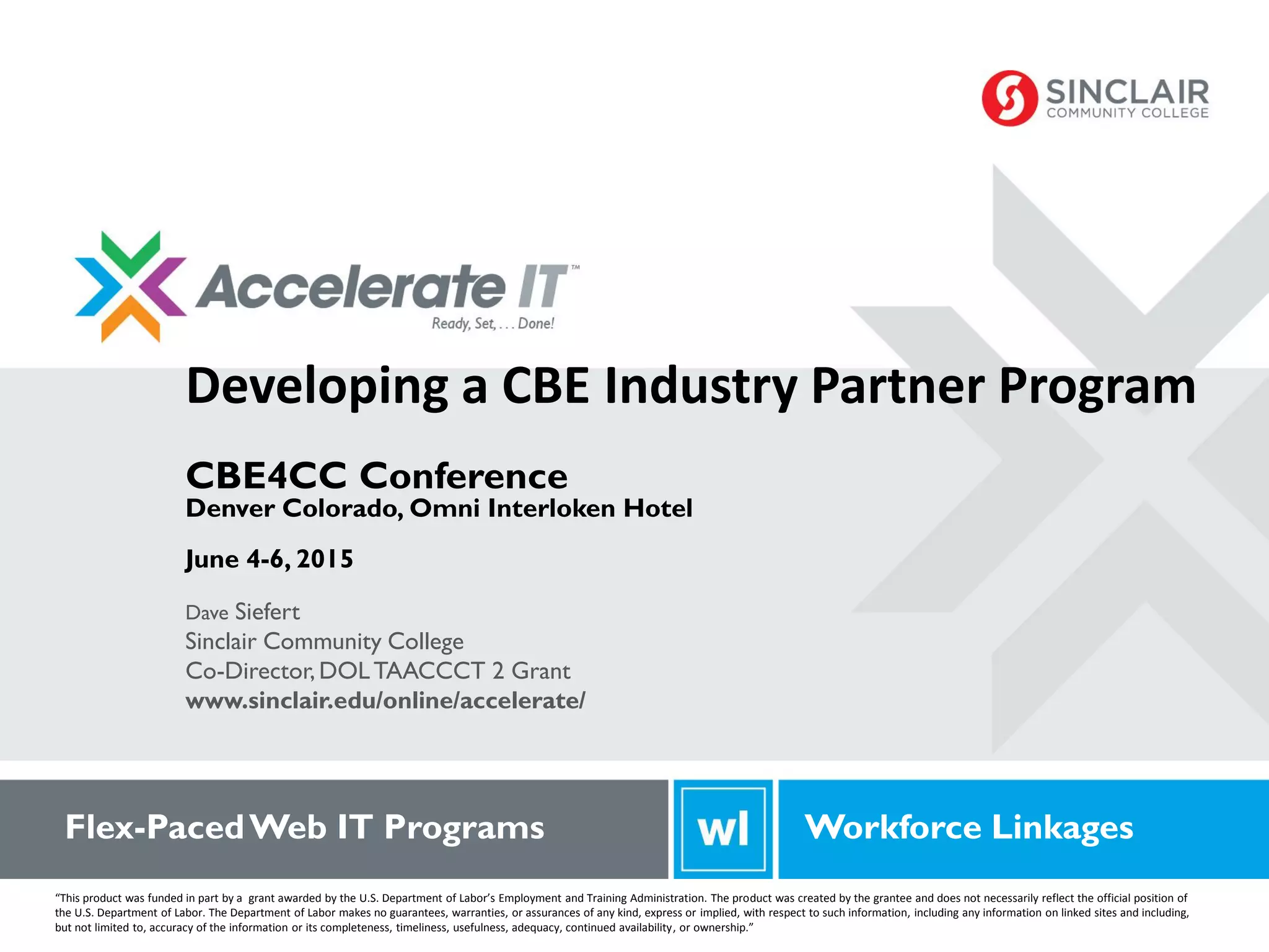 This document summarizes a presentation about developing an industry partner program for competency-based education (CBE) programs. It discusses aligning CBE curriculum with regional employer needs through stakeholder engagement. Austin Community College's accelerated programmer training program is used as a case study. The program recruits industry partners to provide student recruitment, employment opportunities, curriculum input, and program validation. Partners receive early access to job candidates and input on curriculum in exchange for considering graduates and program publicity. Lessons learned include the importance of faculty involvement, compensation structures for outreach, and engaging partners in mock interviews.