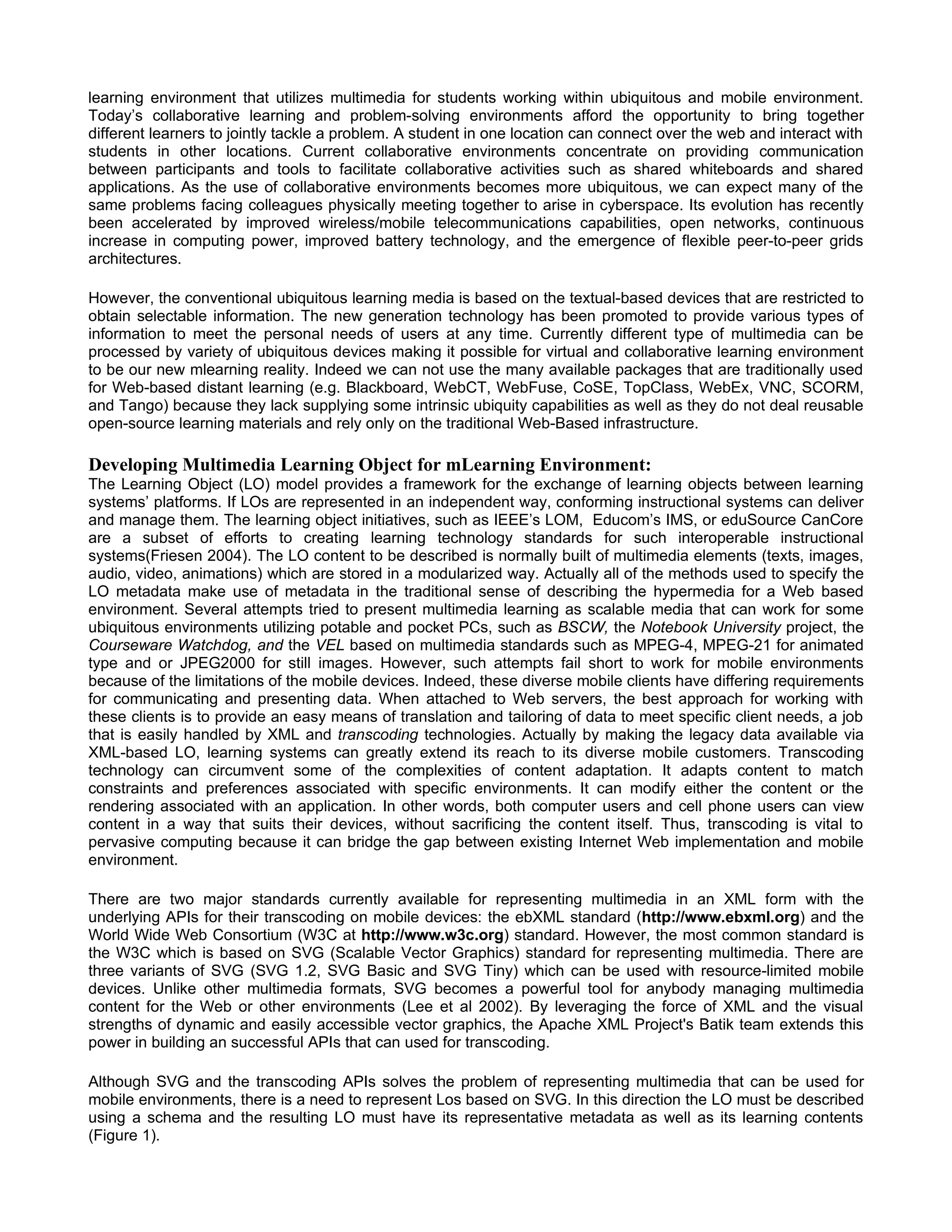 This document presents a framework for designing a collaborative multimedia mobile learning (mLearning) environment based on JXTA infrastructure and SVG-RDF multimedia learning objects. It discusses developing learning objects using SVG and RDF to represent multimedia in a way that can be used on mobile devices. It also discusses using JXTA and JXTA4JMS APIs to provide a peer-to-peer networking infrastructure where students can collaborate using their mobile devices.