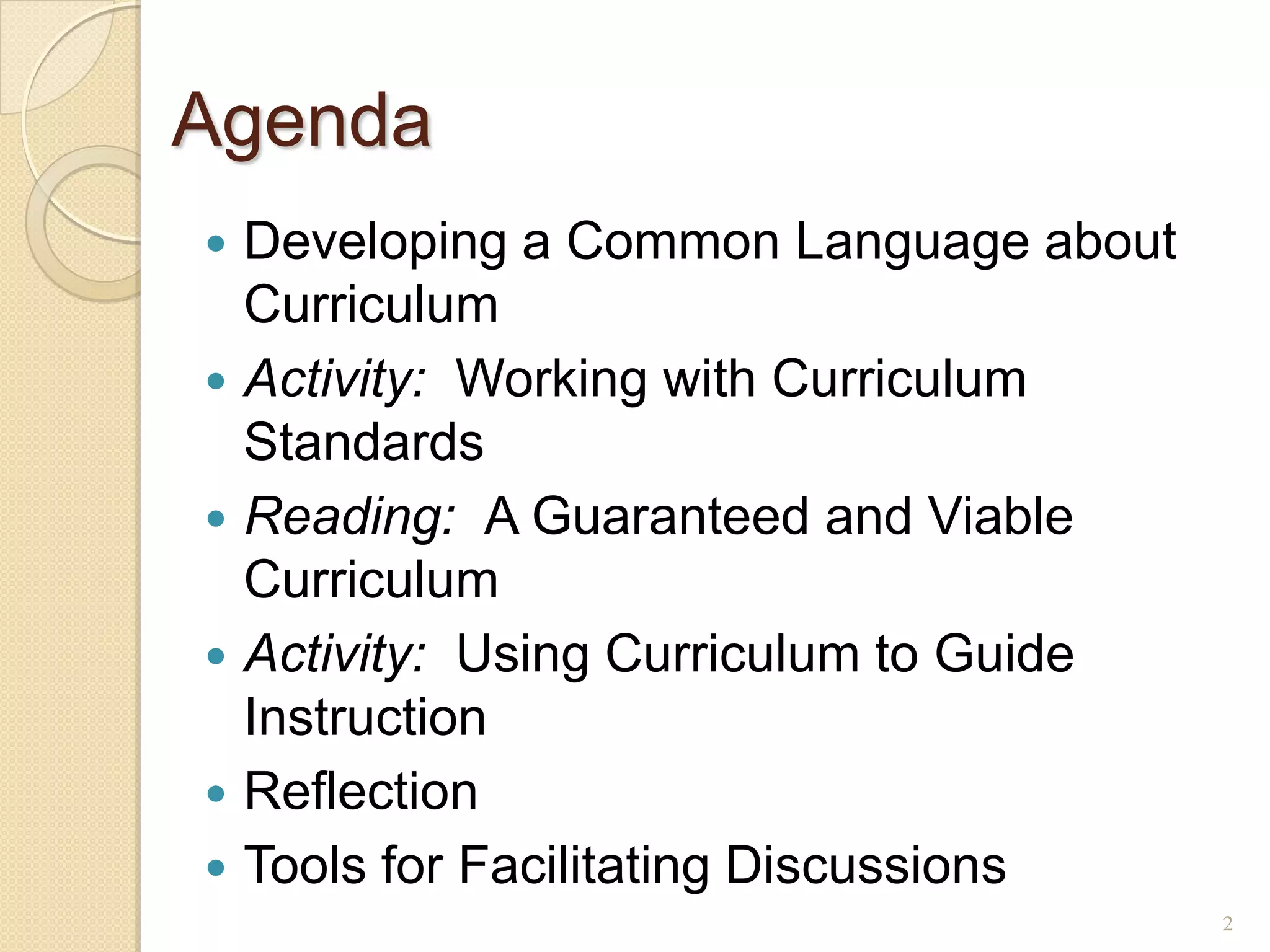 The document discusses developing a common language around curriculum. It defines key terms like curriculum, content standards, and performance standards. Curriculum refers to the what (content standards) and why (performance standards). It also distinguishes curriculum from instruction, which is the how. The document provides examples of standards and discusses making TEKS more specific and vertically aligned. It suggests using curriculum to guide instructional activities and materials. Overall, the document aims to establish a shared understanding of curriculum fundamentals.