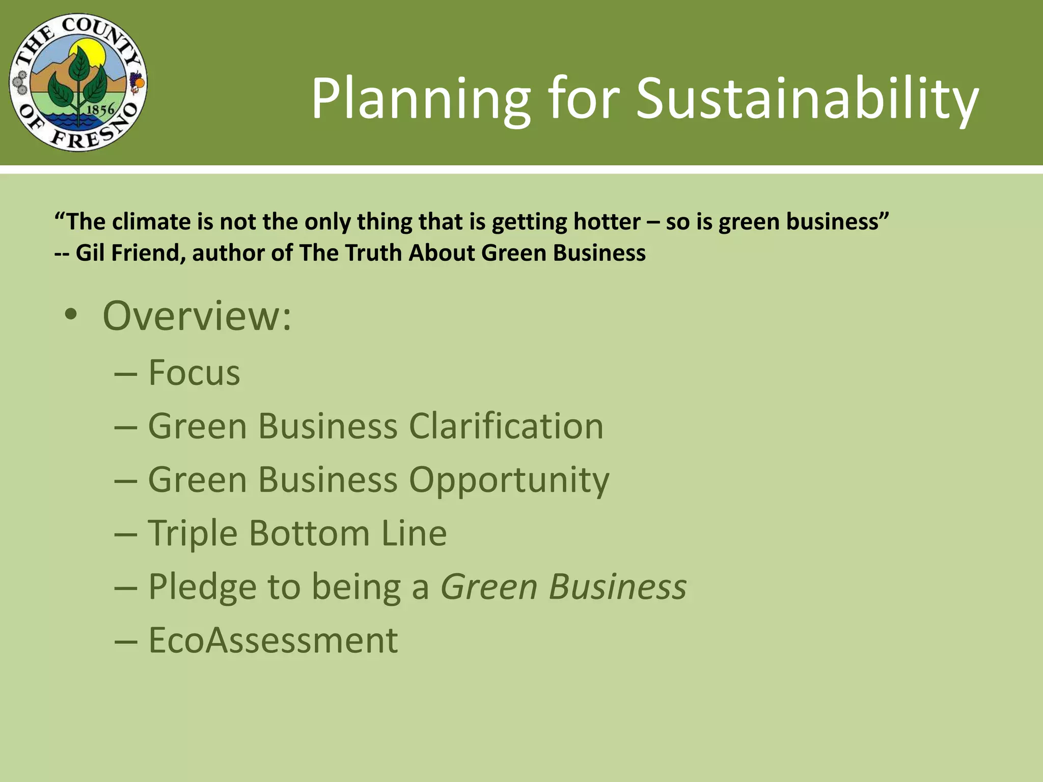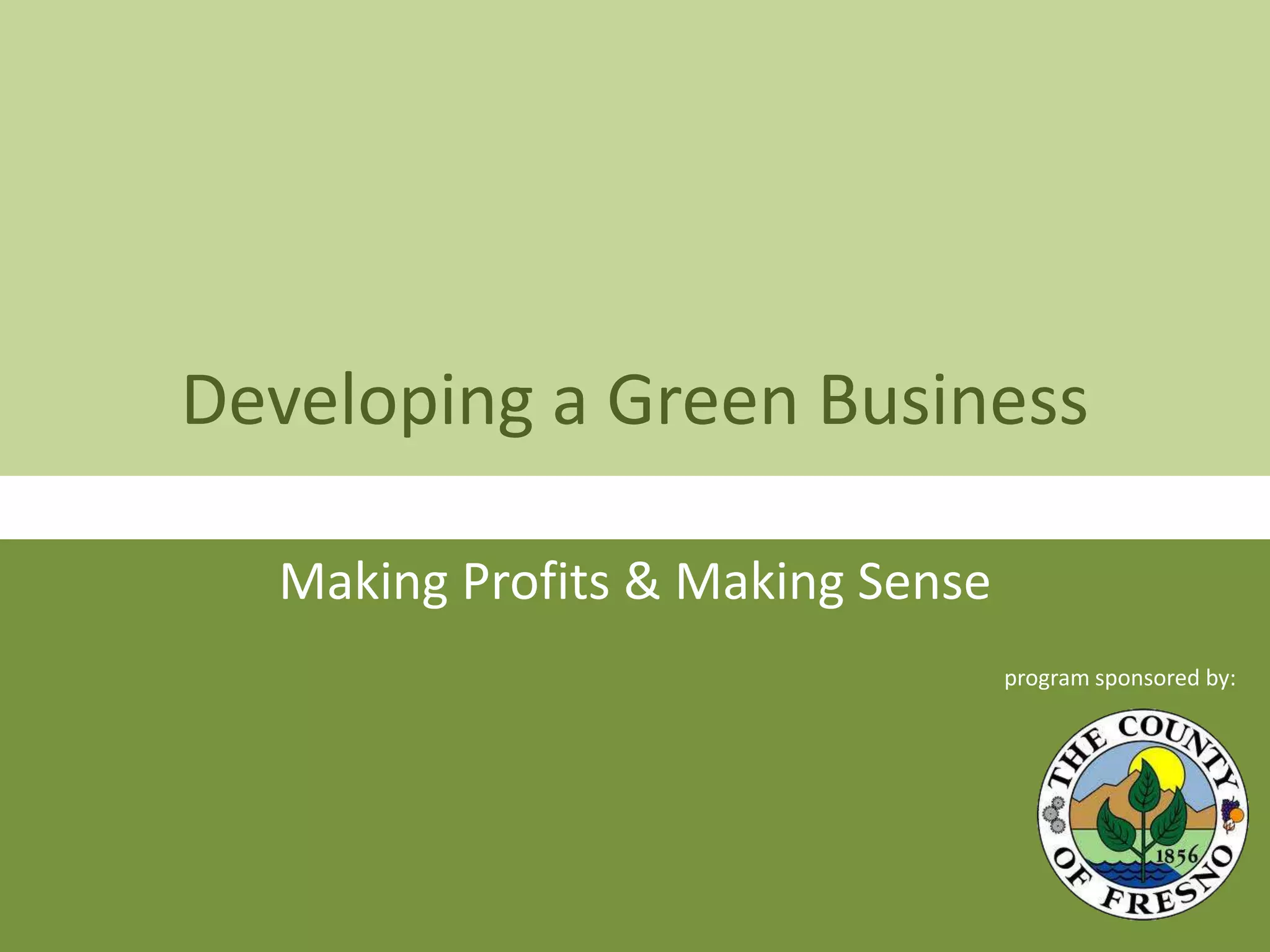 This document provides an overview of developing a green business. It discusses how green business is focused on sustainability, reducing environmental impacts, and social responsibility. Going green can provide economic, environmental, and social benefits through increased profits, reduced costs, innovation, and attracting customers and employees who prefer sustainable businesses. The county program pledges to help businesses create an eco-assessment and eco-plan to make their operations more environmentally friendly and profitable over 12 months, after which businesses that complete the process will receive public recognition.