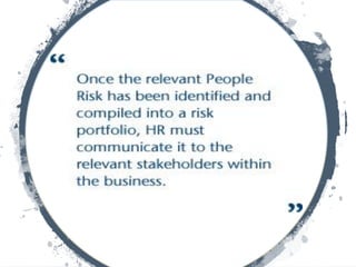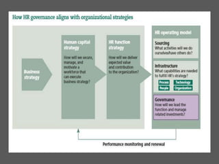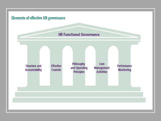 The document presents a comprehensive training program focused on developing a human resource management (HRM) governance framework, covering principles, practices, and processes relevant to corporate governance. It emphasizes the importance of integrating HRM governance with business strategy, utilizing models like the R-E-D-C-A-R framework, and understanding the relationship between HRM and corporate governance. Additionally, it outlines objectives for HRM governance, the significance of aligning HRM practices with organizational goals, and provides guidelines for effective HRM strategy implementation.
