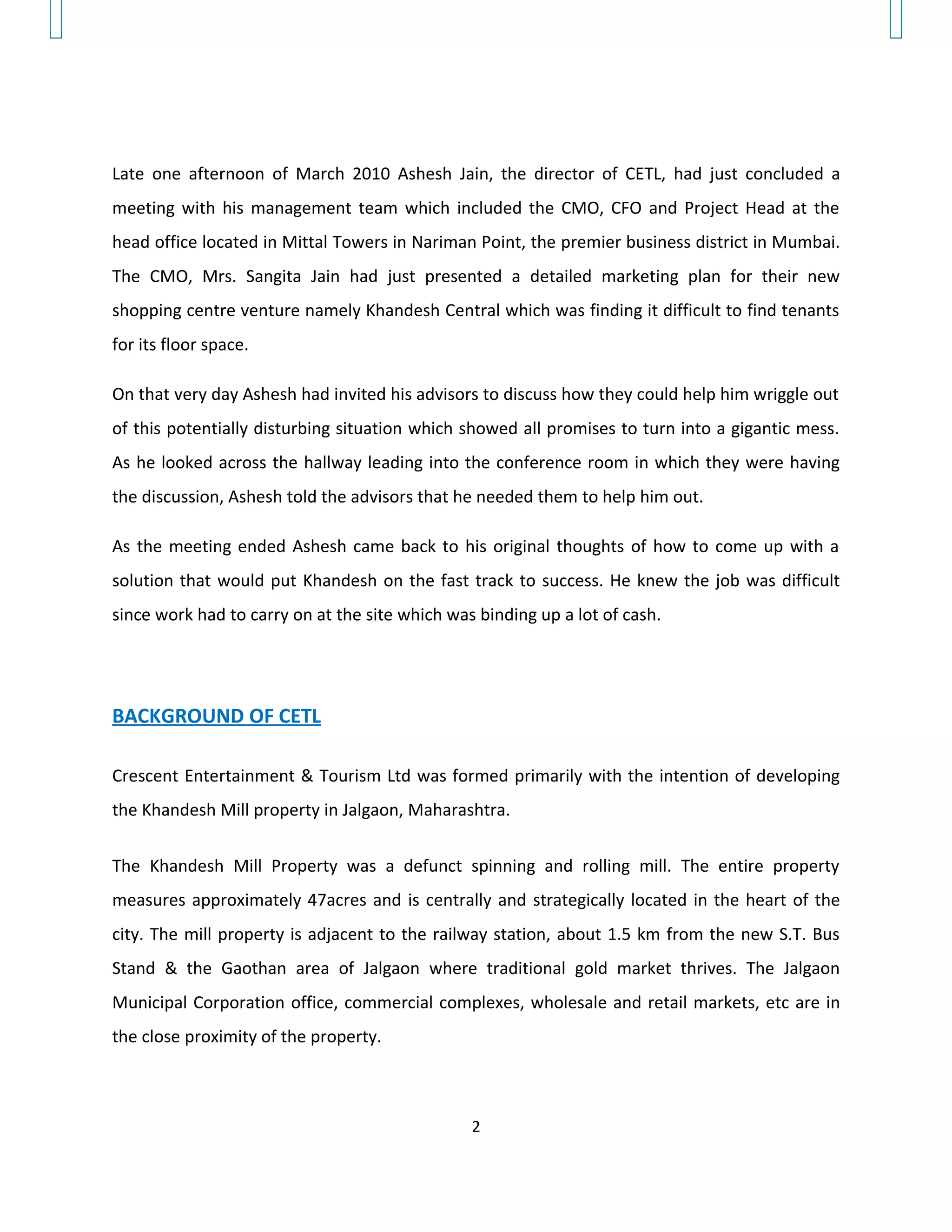 1) CETL is developing a new shopping center called Khandesh Central in Jalgaon, a tier 3 city in Maharashtra, but is struggling to find tenants.