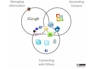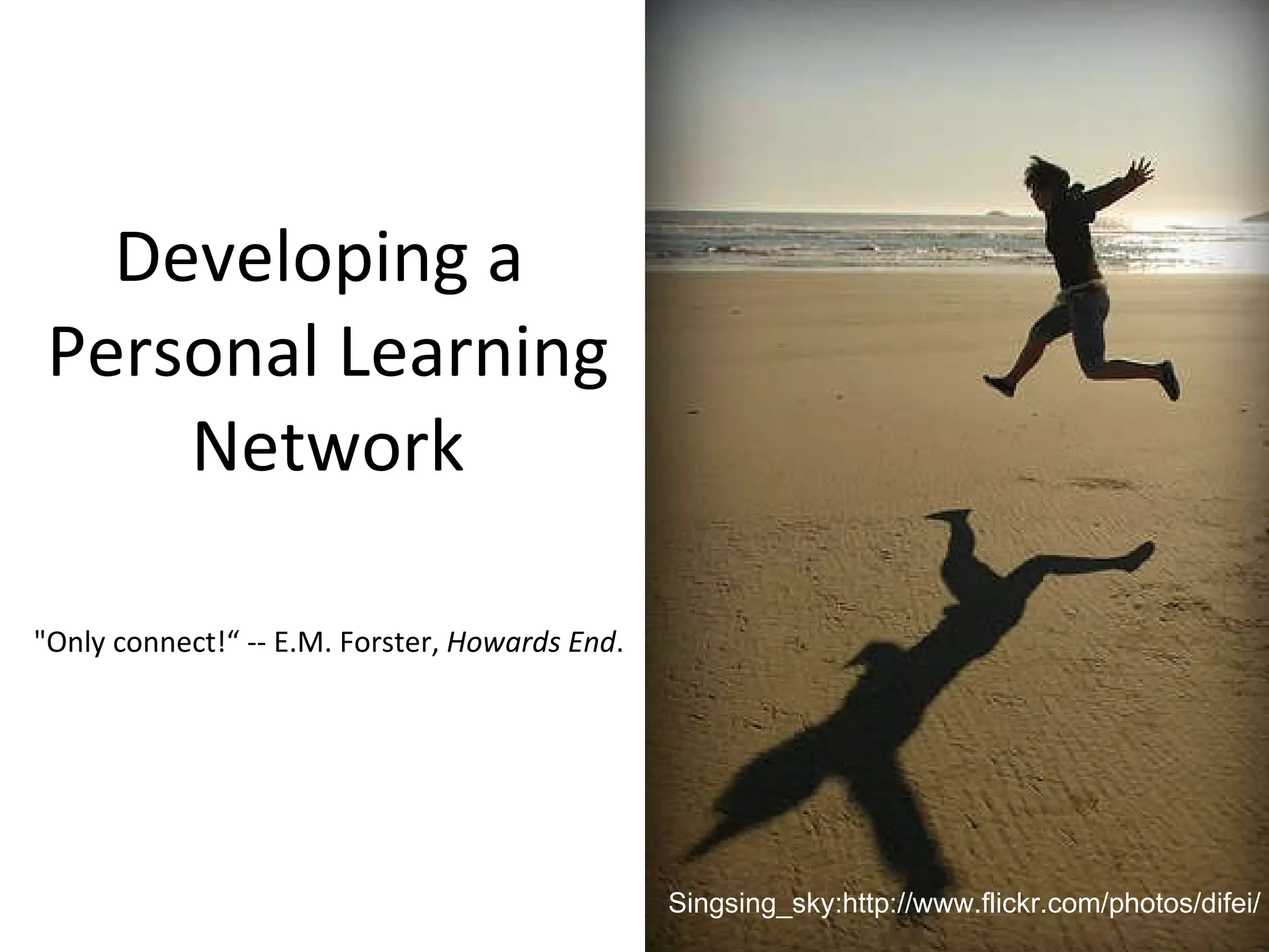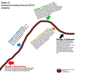 The document outlines steps for developing a personal learning network (PLN) to enhance learning experiences, emphasizing individual control over content and connections. It suggests creating a personalized iGoogle page to curate preferred educational resources and provides various links to relevant networks and online communities for students and educators. Additionally, it mentions an upcoming online symposium focused on learning-centric technology.