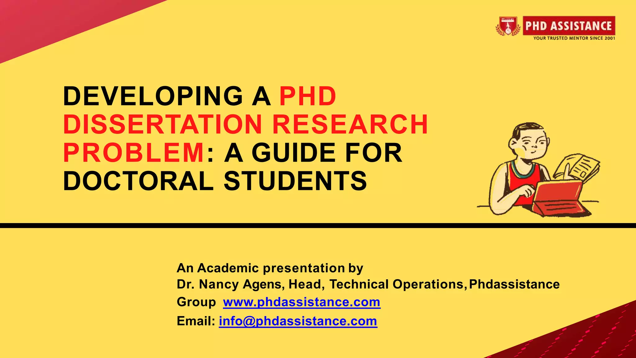 This document is a guide by Dr. Nancy Agens on developing a PhD dissertation research problem, emphasizing the significance of a clear and precise problem statement. It outlines steps for identifying research gaps, understanding the research problem, observing relevant factors, and ensuring the relevance of chosen research topics. The guide highlights that a well-conceived problem statement is essential for the success of a dissertation and helps communicate the research objectives effectively.
