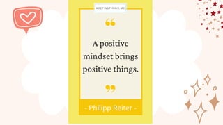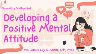 This document discusses developing a positive mental attitude. It defines a positive mental attitude as one that does not hold grudges, succumb to negative thoughts, and has an optimistic outlook. It lists benefits like a happier life, better health, and more success and energy. It provides 11 steps to develop a positive attitude, such as liking yourself, not letting things get to you, being resilient, setting reachable goals, celebrating achievements, being grateful, meditating, and surrounding yourself with positive people. It concludes that positive thinking allows continuous self-improvement and that personality depends as much on mental health as physical appearance.