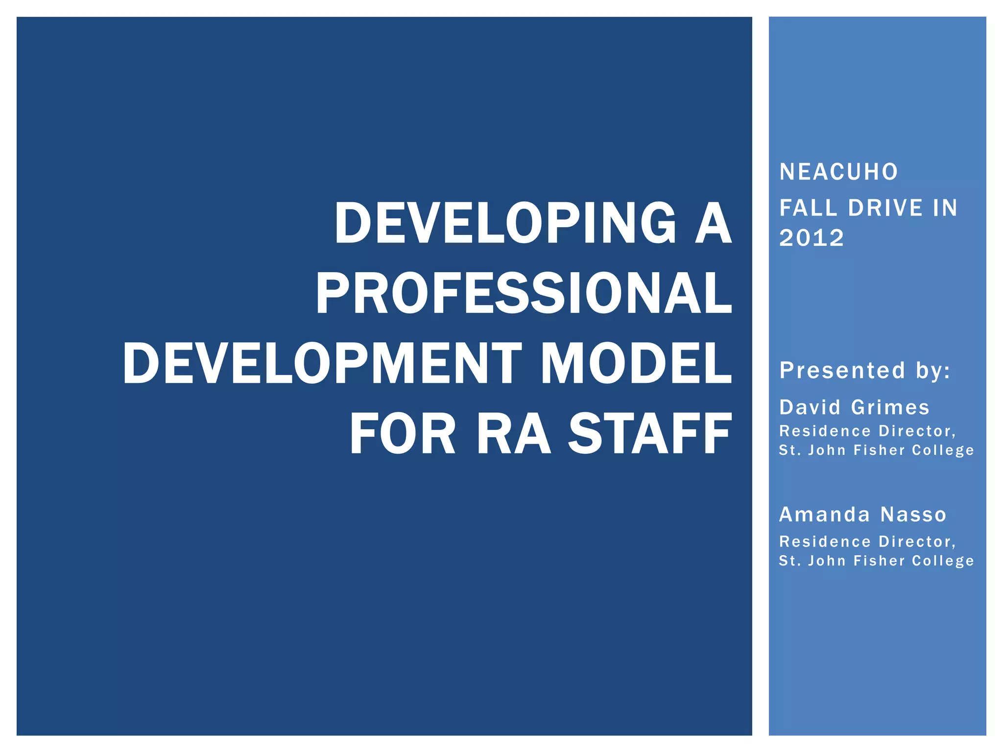 The document outlines the G.R.A.D.E. program developed at St. John Fisher College to enhance the professional development of resident assistants (RAs) by offering structured learning opportunities and responsibilities. It details the core requirements, including in-services, events, and electives, as well as the evaluation process to improve the program's effectiveness. The document also invites collaboration and sharing of resources with other institutions interested in similar professional development initiatives.