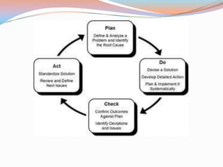 The document discusses techniques for creating a quality culture within an organization. It recommends providing quality goals and measurements at all levels, demonstrating leadership commitment to quality from upper management, empowering employees through self-development opportunities, inspiring action through employee participation, and recognizing and rewarding quality performance. The overall goal is to continuously reinforce the priority of quality throughout the organization.