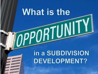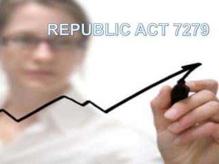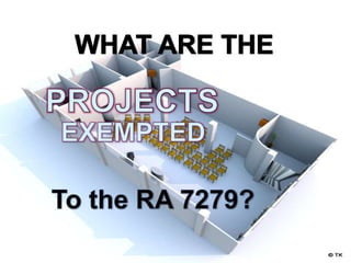 This document discusses the requirements of Republic Act 7279 regarding the development of socialized housing projects (SHPs) in subdivisions. It states that developers must allocate a portion of their total project area, usually 20%, to an SHP. They must also allocate 20% of the total project cost to developing the SHP. SHPs are intended for underprivileged and homeless families and have house and lot packages priced at 150,000 pesos or less. Projects with four units or less or a density of over 100 units per hectare are also covered. Examples are given to illustrate how to determine if a project qualifies for these requirements.