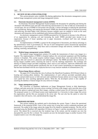 The document describes a developed image file management system that uses a modified AES algorithm to encrypt image files for secure storage and sharing. The system allows users to upload images, encrypt the files using a modified AES algorithm, and share the encrypted files with intended recipients who can decrypt and view and download the images. The system provides a secure way to exchange and share images over a network. Experimental results found that image files were successfully encrypted and stored on the server and could only be decrypted and viewed by authorized recipients.
