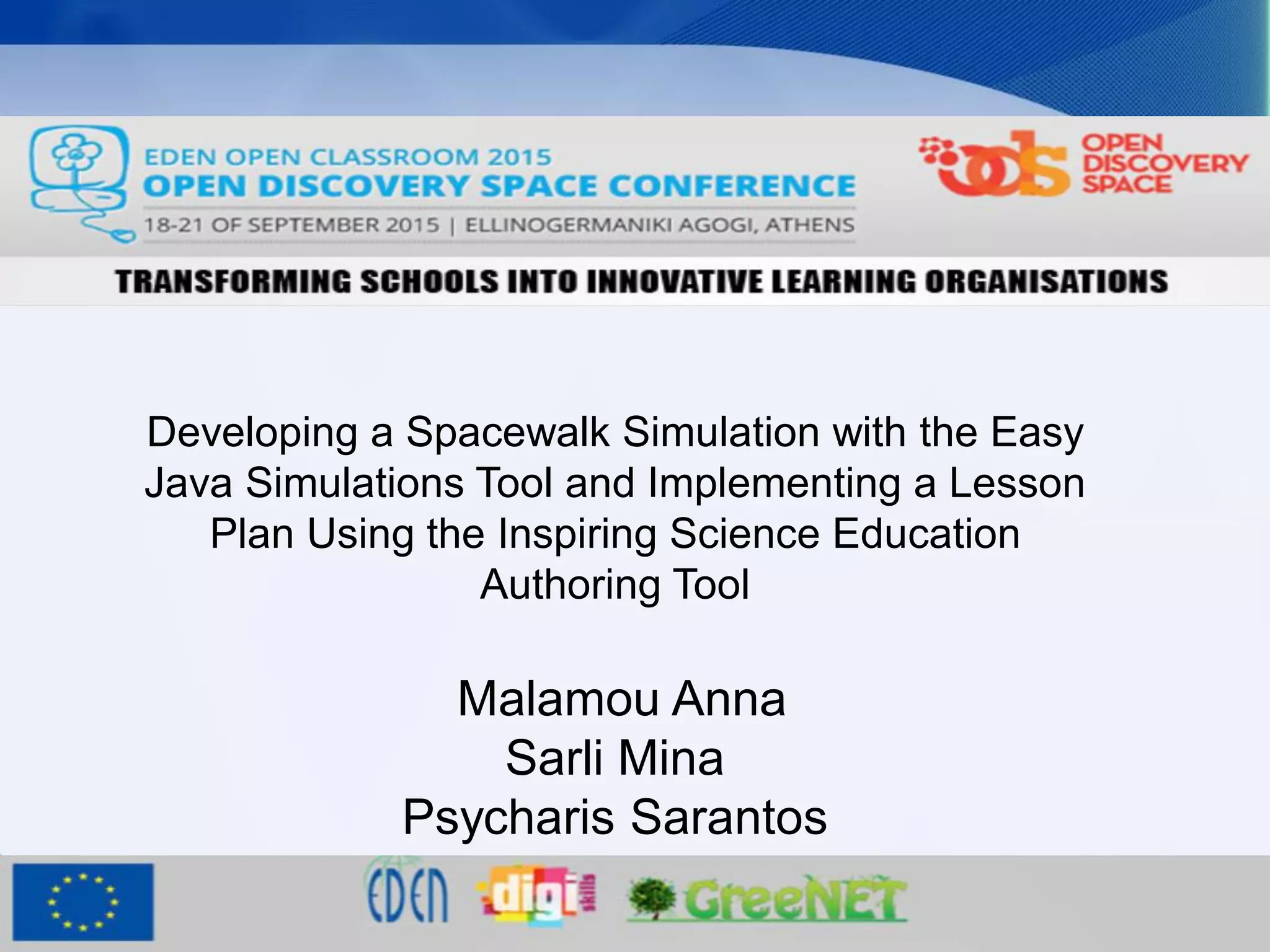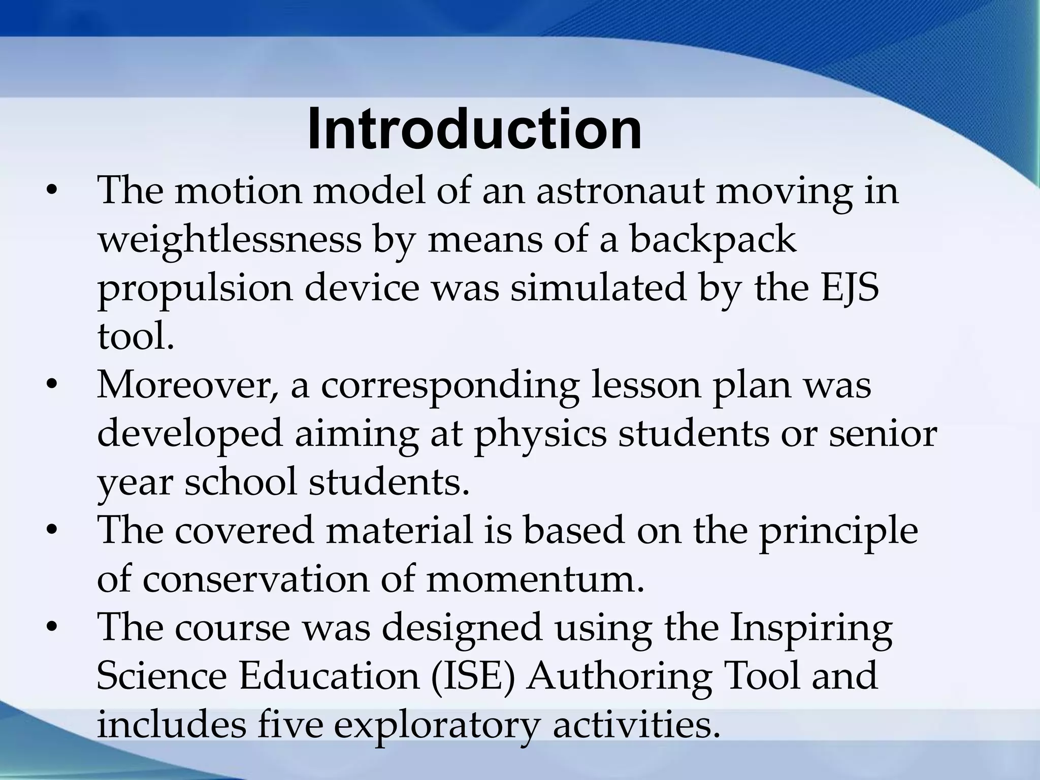 This document discusses the development of a spacewalk simulation using the Easy Java Simulations (EJS) tool and an accompanying lesson plan designed for senior high school physics students. The lesson plan incorporates five phases aimed at engaging students with the principle of conservation of momentum through exploration and experimentation. It emphasizes hands-on learning, allowing students to understand astronaut motion in a weightless environment while using a fuel propulsion device.