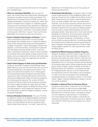 The document discusses the failures of the U.S. immigration and border security system, highlighting issues such as ineffective visa policies, increasing border violence, and the negative implications of amnesty for illegal immigrants. It proposes solutions including enhanced security measures, operational flexibility for the Department of Homeland Security, and the establishment of temporary worker programs to address labor needs. Furthermore, it advocates for targeted federal support for state and local authorities and the enhancement of workplace enforcement initiatives.