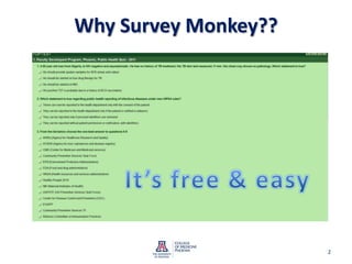 This document outlines the steps to develop an effective survey using Survey Monkey in less than 60 minutes. It discusses: