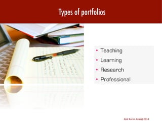 The document discusses developing a teaching portfolio. It describes a teaching portfolio as a collection of materials that document teaching performance and represent a teacher's approach and efforts to promote student learning. Developing a teaching portfolio has benefits both as a product to communicate teaching to potential employers and students, and as a process for teachers to reflect on their development, strengths, and areas for improvement. The document provides guidance on the types of materials and artifacts to include in a teaching portfolio such as a teaching philosophy statement, examples of course materials, and feedback from students and peers.