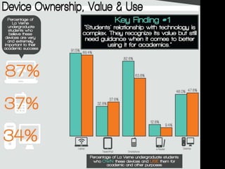 The University of La Verne used multiple sources of data to redesign its liberal studies teacher education program to better integrate technology. Data from student and faculty surveys informed changes to course content and delivery, including increasing the use of mobile technologies, online resources, and blended learning. Courses were redesigned over three years to align assessments with learning outcomes, develop online materials like interactive eBooks, and require skills like video creation. Faculty development introduced skills like screencasting and supported consistent technology integration. The redesign aimed to improve student and instructor technology literacy for teaching.