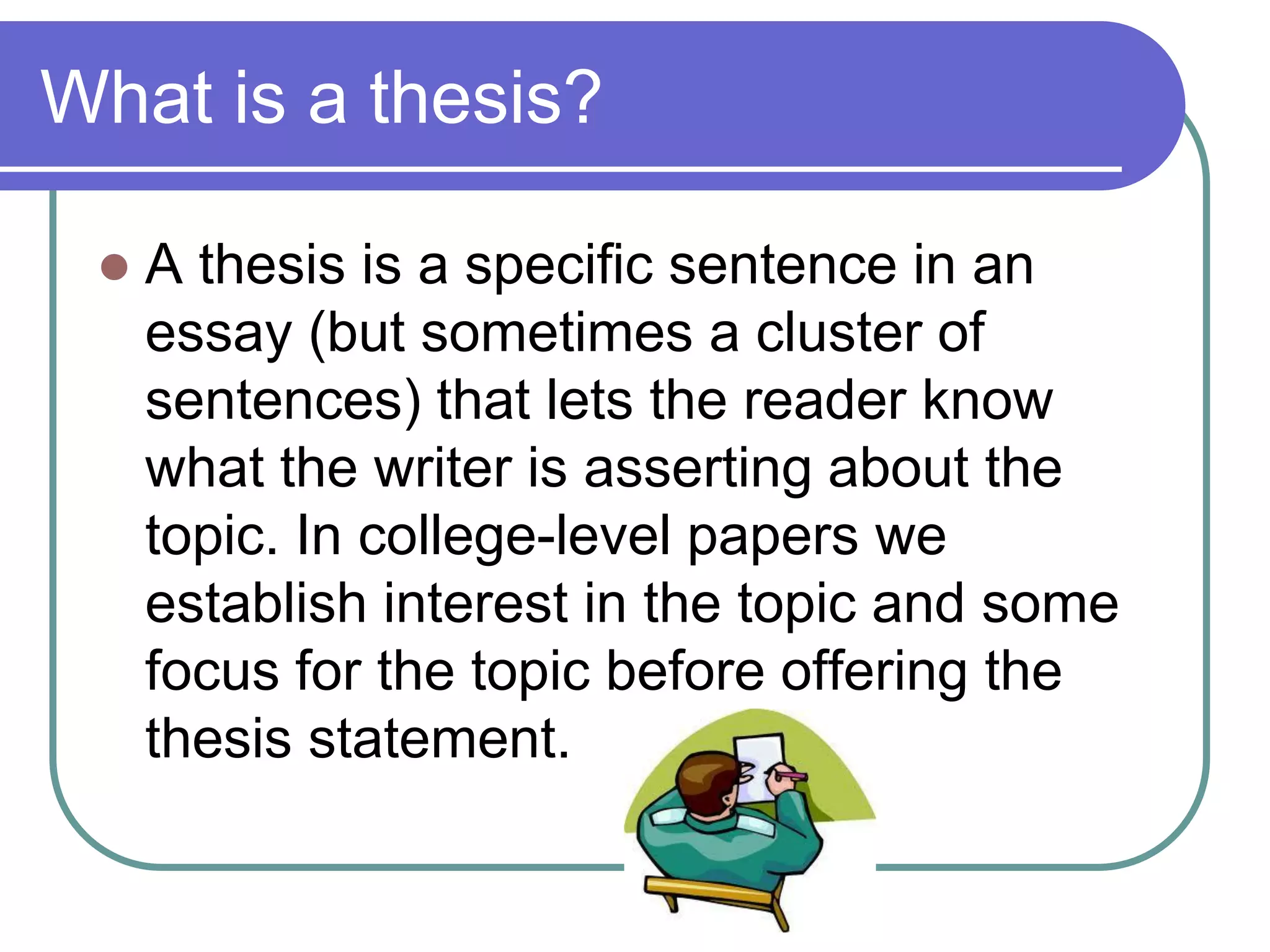 The document provides tips for developing a strong thesis statement. It explains that a thesis statement makes a specific claim about a topic that can be supported with evidence. It should take a clear stand rather than just announcing the topic. A good thesis is narrow and specific rather than broad and vague. It asserts an argument rather than just stating a fact. The document emphasizes that a thesis is a work in progress and can be revised as the paper develops.