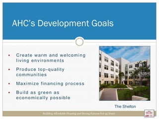AHC Inc. has been developing affordable housing for 35 years, facing challenges such as competition for properties and financing processes. Innovative approaches include blending affordable and market-rate units, creative financing solutions, and energy-efficient designs. Key projects mentioned are the Jordan and Macedonian apartments, which emphasize collaboration with local partners and community-focused amenities.