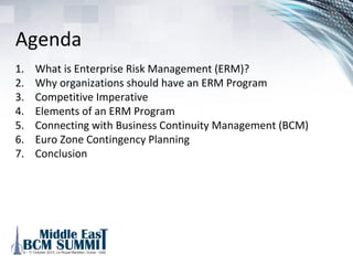 The document discusses enterprise risk management (ERM), emphasizing its importance for organizations to identify and manage key risks effectively. It outlines the elements and benefits of a robust ERM program, including improved regulatory compliance, cost efficiency, and strategic decision-making. Additionally, it connects ERM with business continuity management (BCM) and highlights the need for a structured approach to address potential risks in the context of euro zone contingency planning.