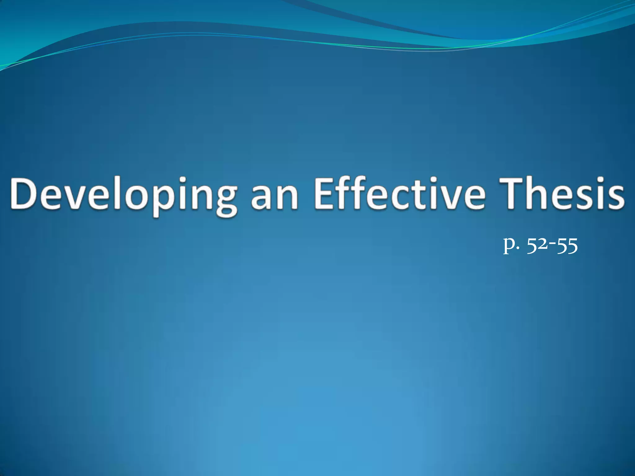 The document discusses how to write an effective thesis statement. It states that a thesis should make a specific central point about the topic in one or two sentences. It provides examples of strong and weak thesis statements. The document then lists 9 qualities of an effective thesis, such as stating the topic and central point clearly, limiting the thesis to one topic and point, avoiding broad statements, and expressing the central point in specific words without announcements or opinions. It concludes by advising the reader to review their thesis to ensure it is clear and supported.