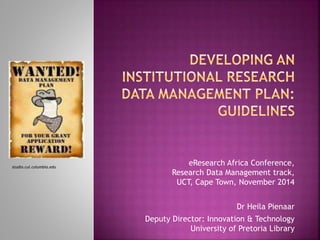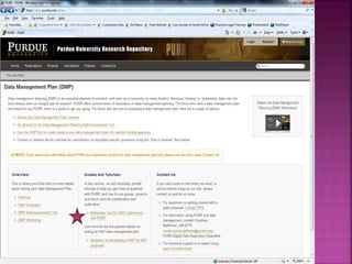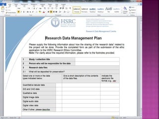 The document discusses the importance of a data management plan (DMP) in research, outlining its role in organizing, storing, and sharing research data, while ensuring compliance with policies and ethical requirements. It emphasizes the need for research teams to establish a DMP at the beginning of their projects and provides guidelines on what elements to include. Additionally, it encourages the use of existing examples to create a framework that suits institutional needs.