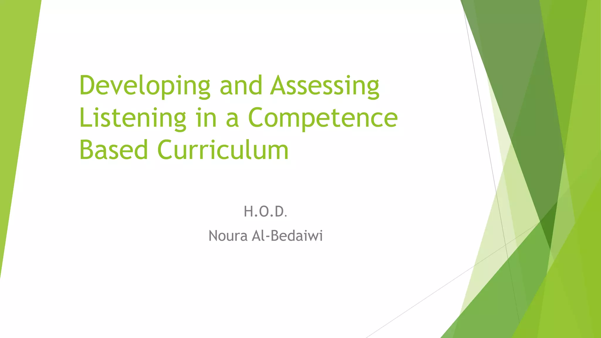 This document discusses developing and assessing listening skills in a competence-based curriculum. It emphasizes that assessment should have a clear purpose, choose an appropriate method based on the context, and involve a process. Formative and summative assessments can include projects, games, worksheets, and tasks. Listening can be measured by aligning varied tasks to curriculum standards and descriptors, and using suitable assessment tools like observations, portfolios, and rubrics. Examples of listening descriptors in rubrics include recognizing and describing concepts, categories, and responding appropriately to questions.