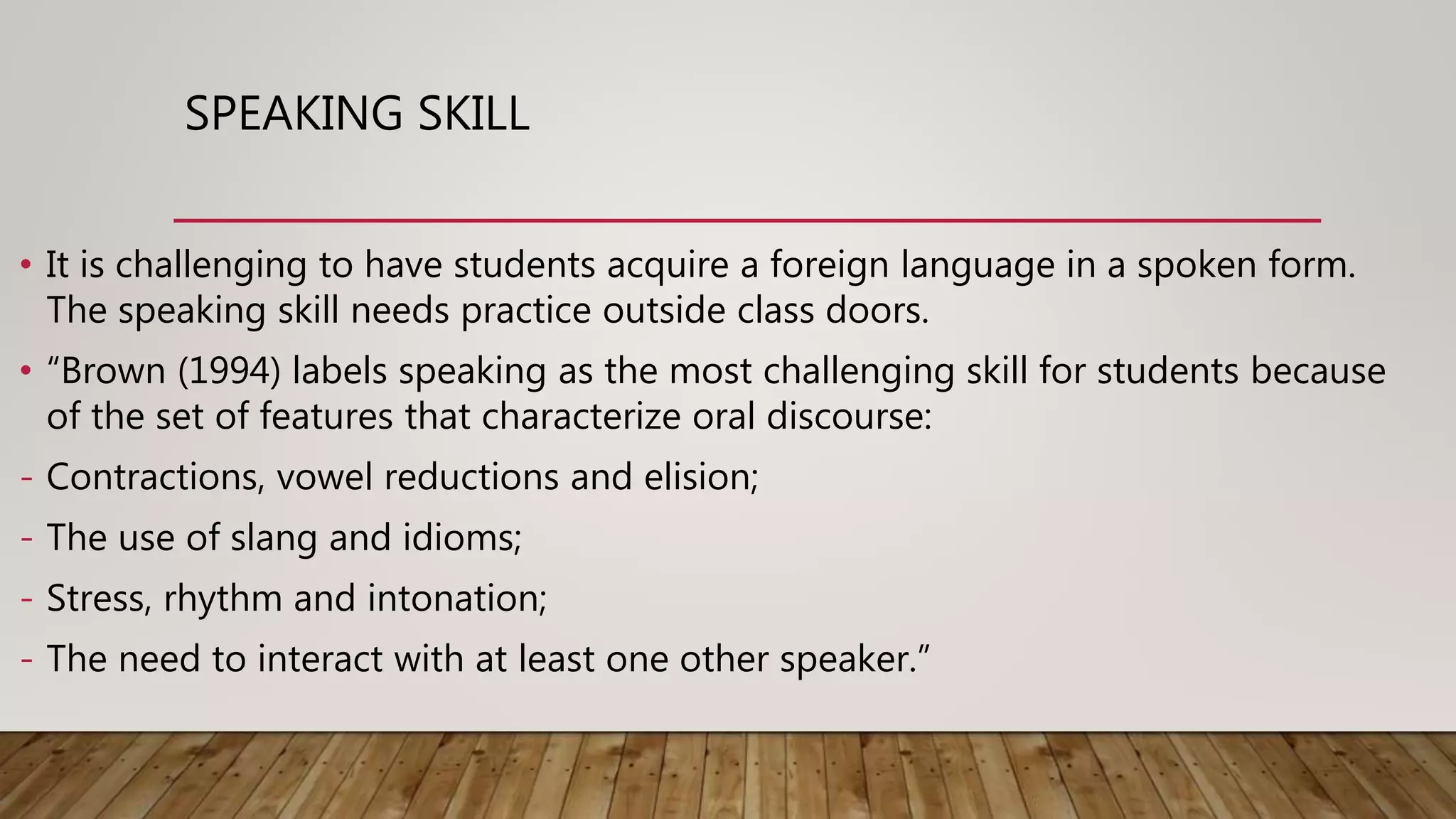 The document discusses the challenges students face in acquiring speaking skills in a foreign language, highlighting the complexities of oral discourse such as stress, rhythm, and idiomatic expressions. It emphasizes the importance of creating a safe and enjoyable environment for practice, utilizing tasks like presentations and games, and providing supportive formative assessments. Effective teaching strategies include encouraging communication in simple language and authentic dialogues to enhance students' speaking abilities.