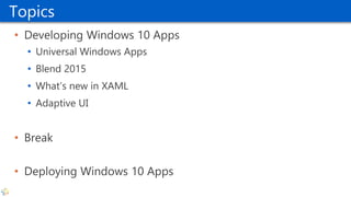 The document discusses the development and deployment of Windows 10 applications, focusing on the Universal Windows Platform (UWP) and its unified core for all devices. It highlights adaptive UI features, various deployment methods, app monetization strategies, and key considerations for writing successful apps, including design and built-in virality. The content provides insights for developers on tools like Blend 2015 and emphasizes the importance of a strong app design and marketing approach.