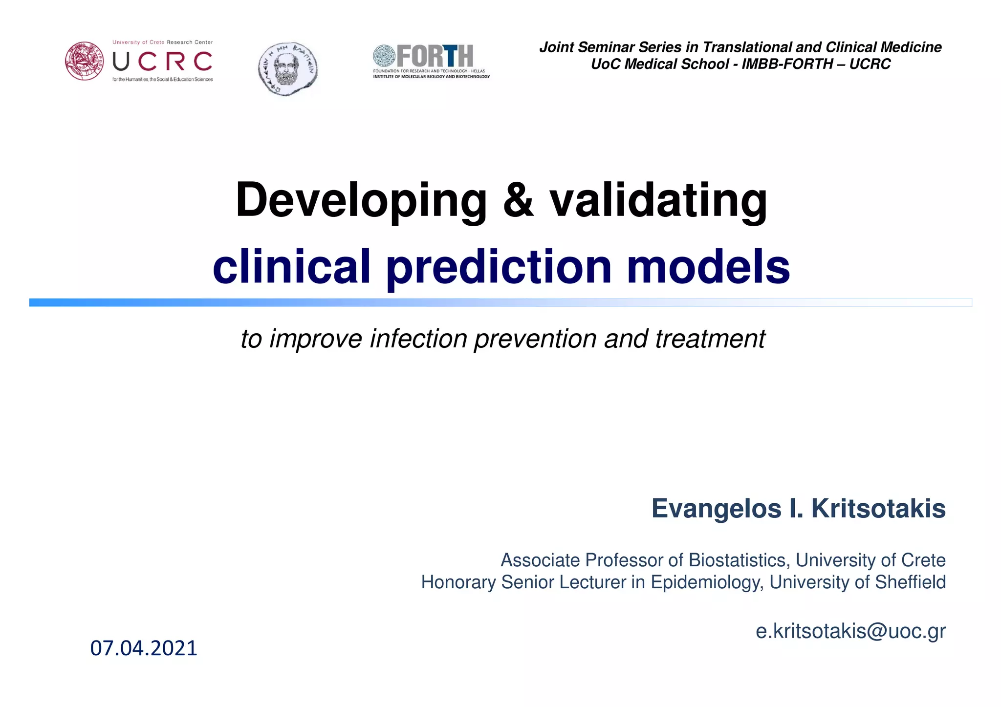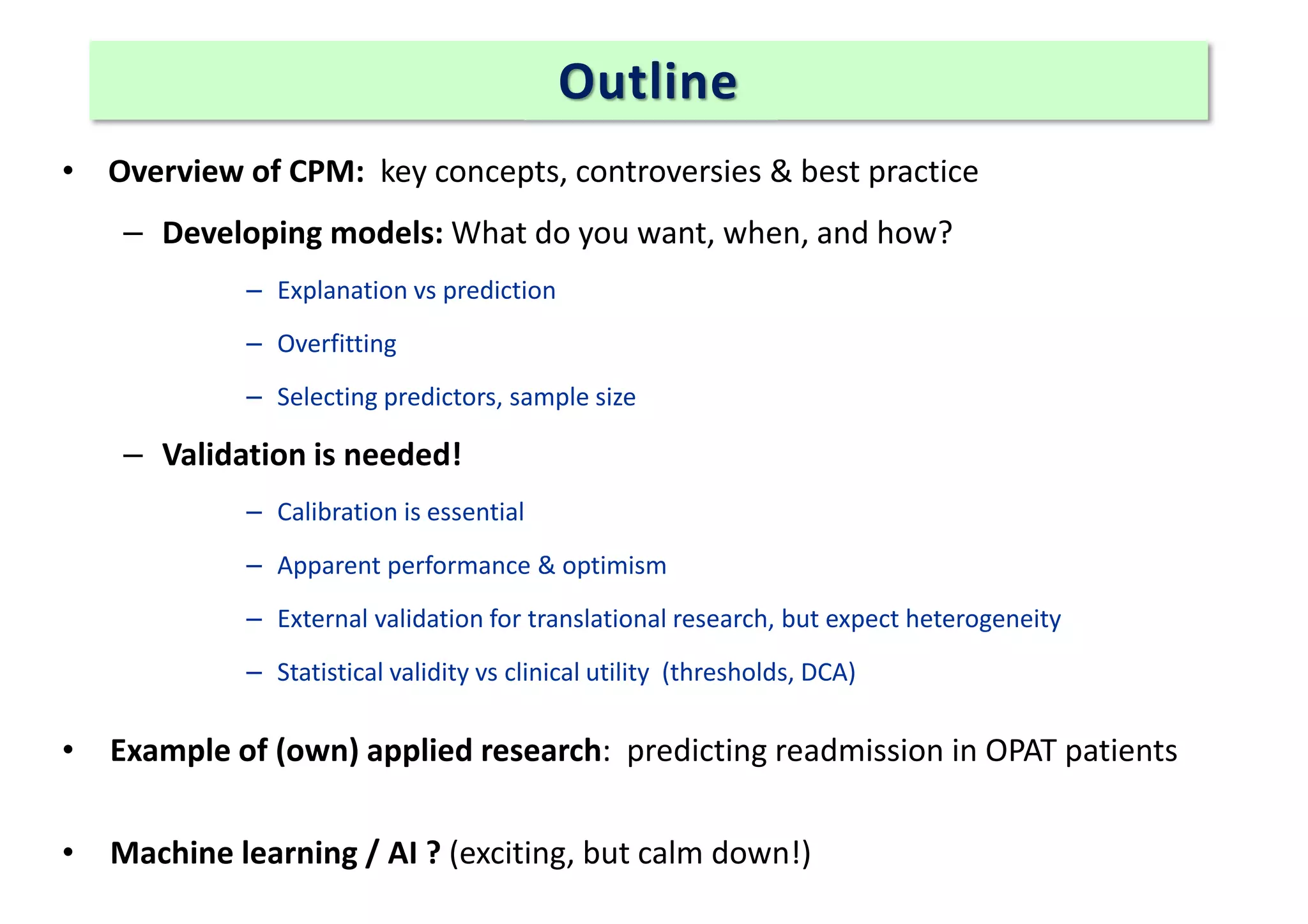 The document discusses the development and validation of clinical prediction models (CPMs) aimed at improving infection prevention and treatment. Key topics include the distinction between explanation and prediction, the importance of calibration, overfitting, and the necessity for appropriate model validation through internal and external methods. An example from applied research predicting hospital admissions in outpatient parenteral antimicrobial therapy is provided to illustrate the practical implications of CPMs.