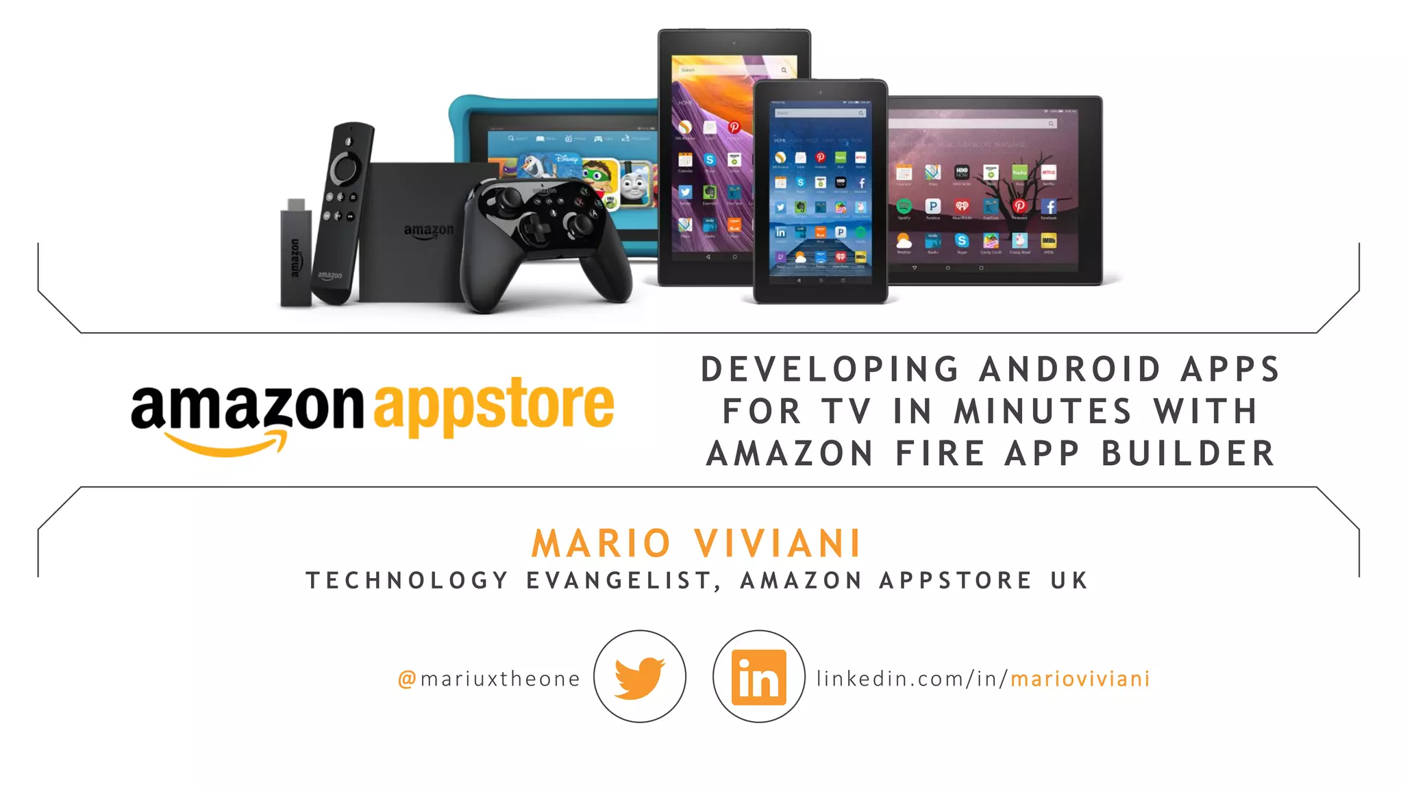 The document introduces Mario Viviani, a technology evangelist specializing in developing Android apps for Amazon Fire TV using the Fire App Builder. It outlines the features of the Amazon Fire TV, discusses the capabilities of the Fire App Builder for creating media apps quickly, and provides guidance on app development and submission processes. Additionally, it highlights advanced functionalities, customization options, and the analytics available for apps made with the Fire App Builder.