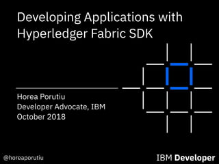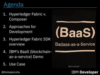 The document discusses Hyperledger Fabric and the Hyperledger Fabric SDK. It provides an overview of the Fabric SDK and demonstrates how to use it to interact with a Hyperledger Fabric network, including enrollment, invoking chaincode to read and write to the ledger, and submitting transactions. It also discusses an IBM Food Trust use case for tracking food supply chains using Hyperledger Fabric.