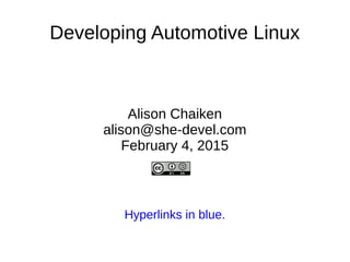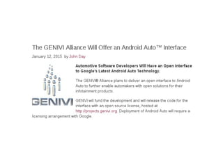 Automotive Linux is being used by several major automakers for vehicle infotainment systems. Some deploy Android natively using containers or hypervisors, while others use QNX or Windows. Android deployment varies but often uses Linux containers to isolate apps from the real-time operating system. Resources for automotive Linux include GENIVI, Automotive Grade Linux, and OpenXC, which provides vehicle data access. While Android Auto and CarPlay are desirable, Android struggles to replace incumbent QNX directly in vehicle control systems due to safety and real-time constraints.