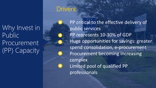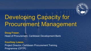 The document discusses the importance of developing capacity in public procurement management, highlighting its significant impact on public service delivery and economic savings. It outlines necessary reforms, including establishing procurement policies, training stakeholders, and improving contract management to ensure effective procurement processes. The Caribbean Development Bank's new procurement framework emphasizes best practices centered on value for money, integrity, and transparency while addressing the complexities of modern procurement.