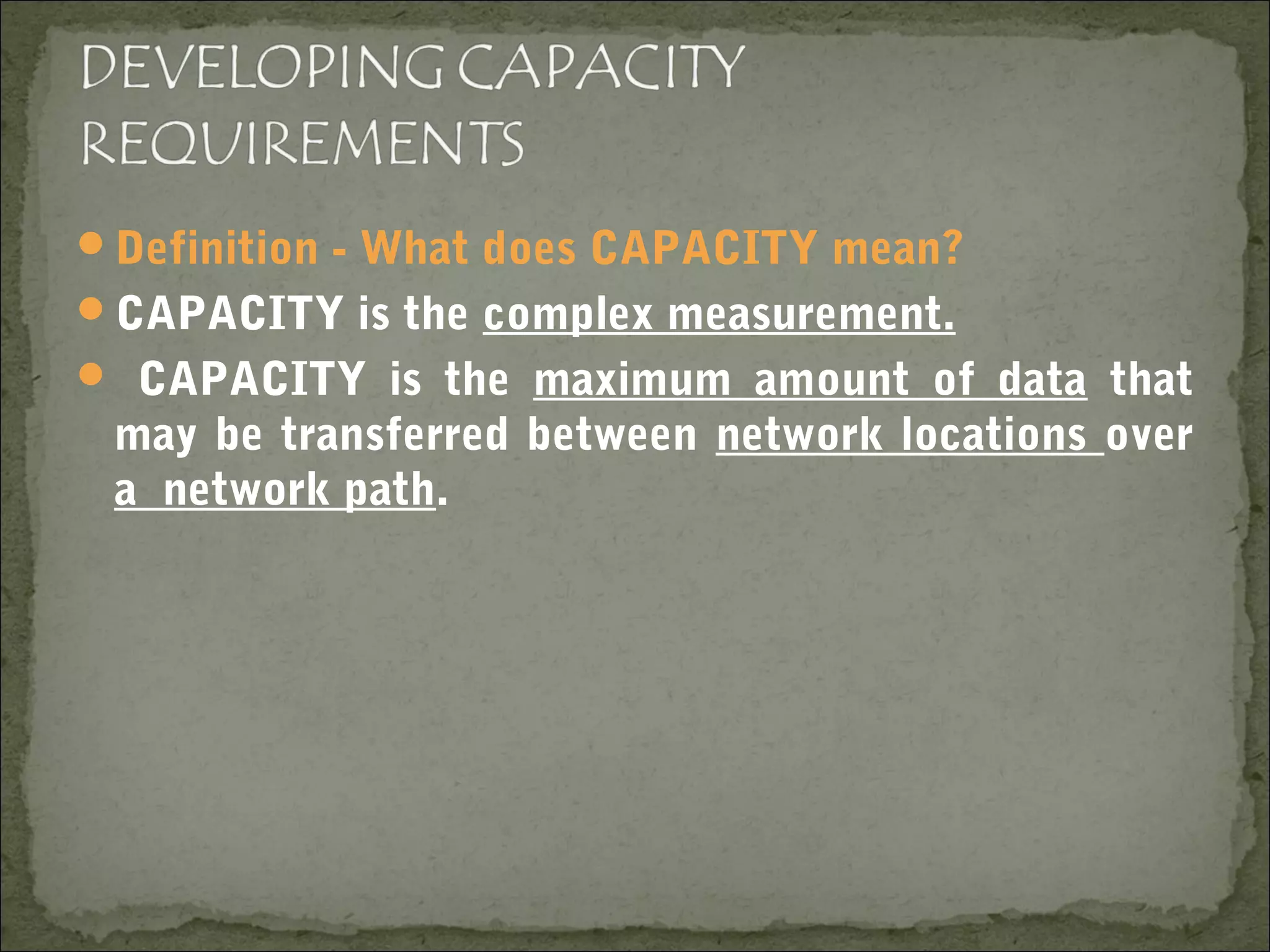 Capacity is defined as the maximum amount of data that can be transferred over a network path. There are three common data rates used to estimate capacity: peak data rate, which is the fastest transfer speed available in short bursts; sustained data rate, which measures the total data delivered over time and is used to improve system performance; and minimum data rate, which is the slowest transfer speed and is important for applications like video streaming that require a consistent data flow.