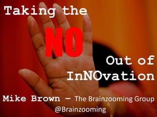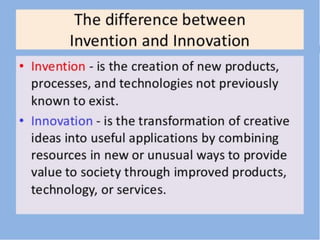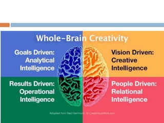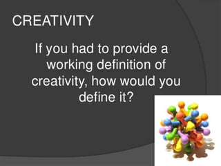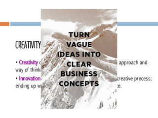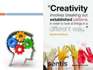 This document provides an outline and overview of developing creative and innovative thinking in the workplace. It discusses what innovation and creativity are, different types of innovation, the value of creativity and innovation, and tips for enhancing creativity. It also presents frameworks for organizational creativity and innovation, including balancing the opposing forces of create and control. The document emphasizes that innovation happens through solving problems for people and outlines habits of creative thinkers. It also includes an example activity to experience the creative process in designing packaging.