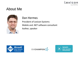 The document is a detailed overview of developing cross-platform native mobile applications using Xamarin, emphasizing its advantages, such as shared code and native performance. It discusses various mobile app types, the challenges of multi-platform development, and highlights Xamarin's architectural benefits, including access to native APIs and compatibility across iOS, Android, and Windows. Additionally, it mentions practical applications, client case studies, and services offered by Dan Hermes and his firm, Lexicon Systems.