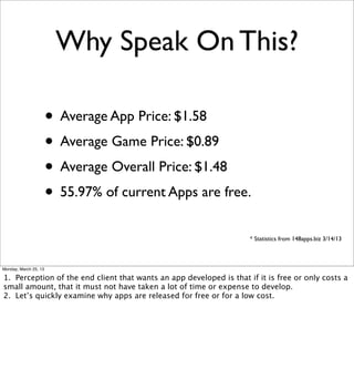 1. The document discusses the perceived value gap between typical retail app prices of $1.58 on average and the higher costs of developing custom enterprise apps.