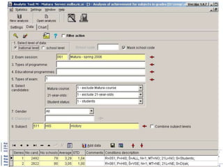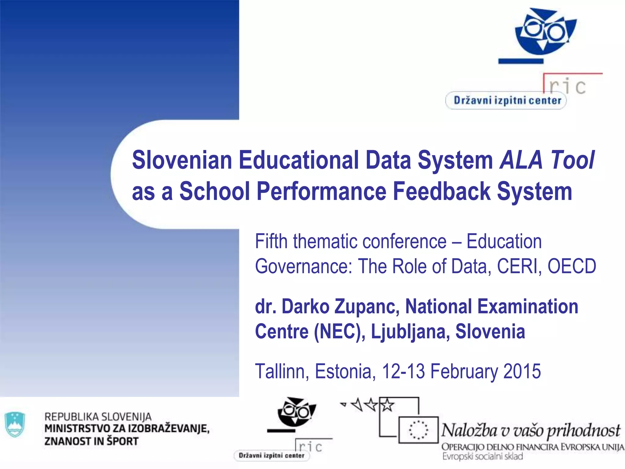 The document discusses Slovenia's educational assessment system, specifically the external matura examination and the assessment of/for learning analytic (ALA) tool developed by the National Examination Centre. The ALA tool provides data analysis for school performance improvement at various educational levels and supports decision-making regarding effective teaching and student learning. Despite its benefits, the tool's usage is lower than expected, and future plans include promoting its use, upgrading with socioeconomic data, and developing tools for lower educational levels.