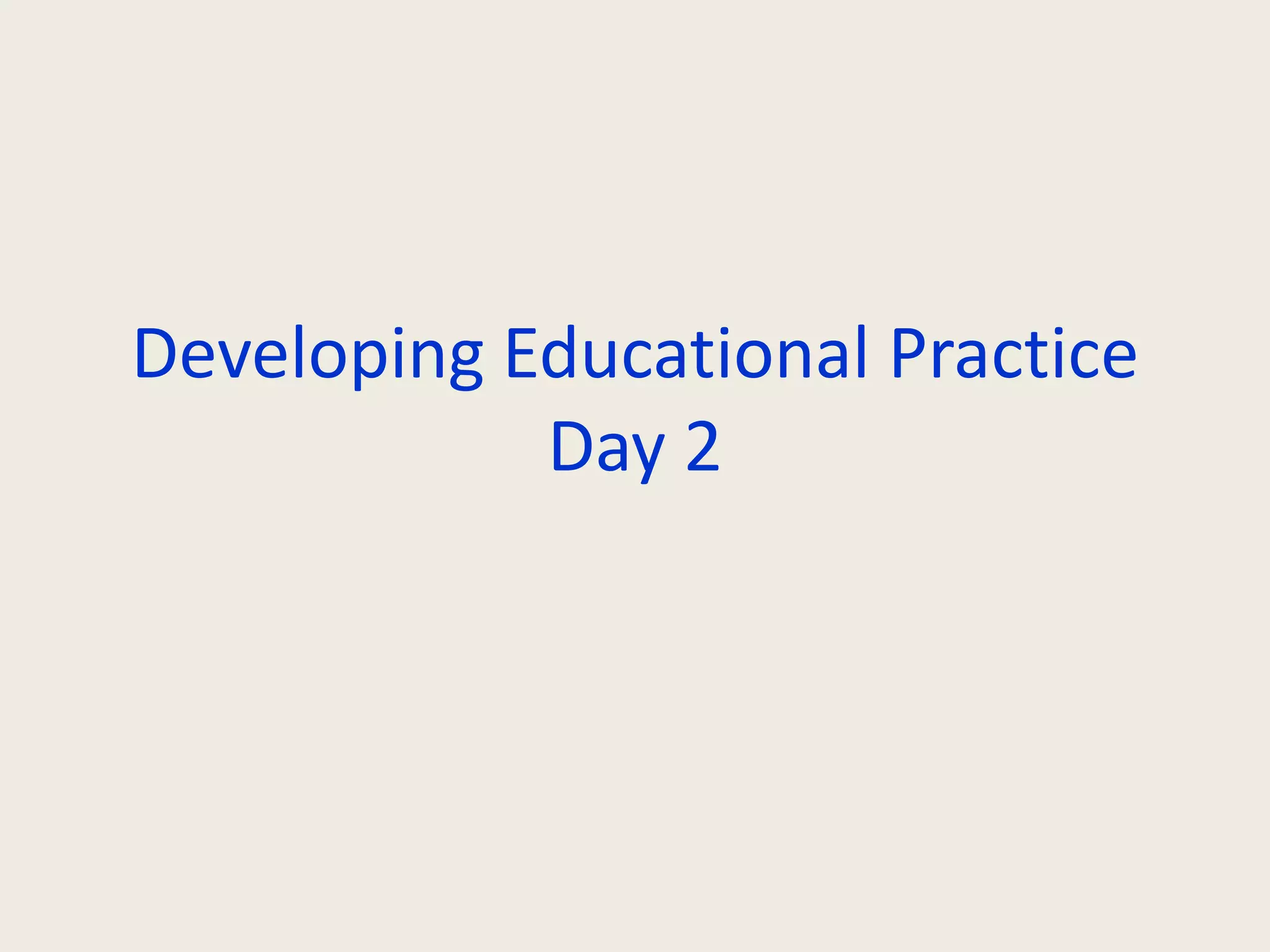 The document outlines a Day 2 curriculum focused on the importance of reflection in teaching and learning. It includes discussions on student-centered learning, designing curriculum, and using various teaching formats such as one-on-one sessions and small groups. Participants are tasked with collaboratively creating a course framework, addressing course aims, learning outcomes, assessments, and engagement strategies.