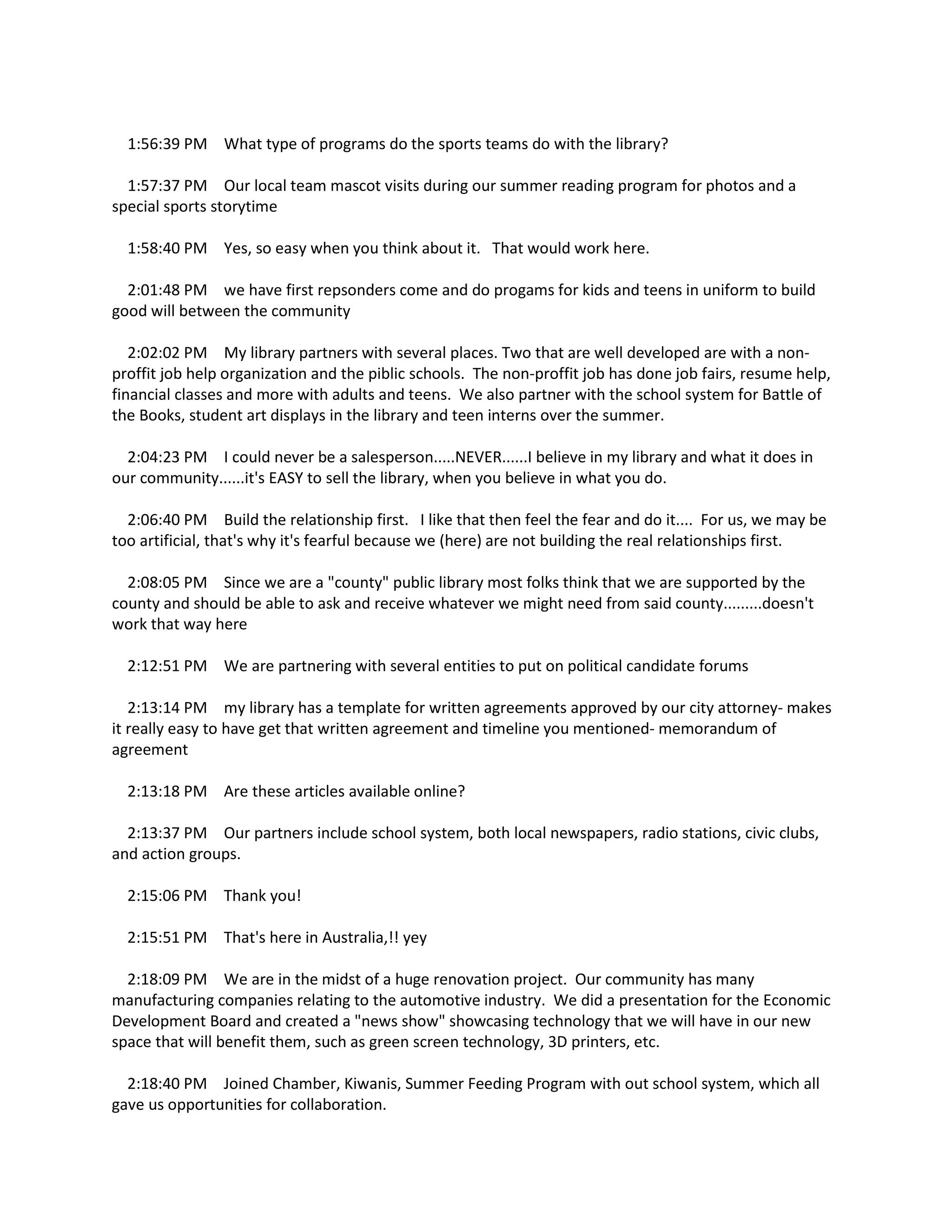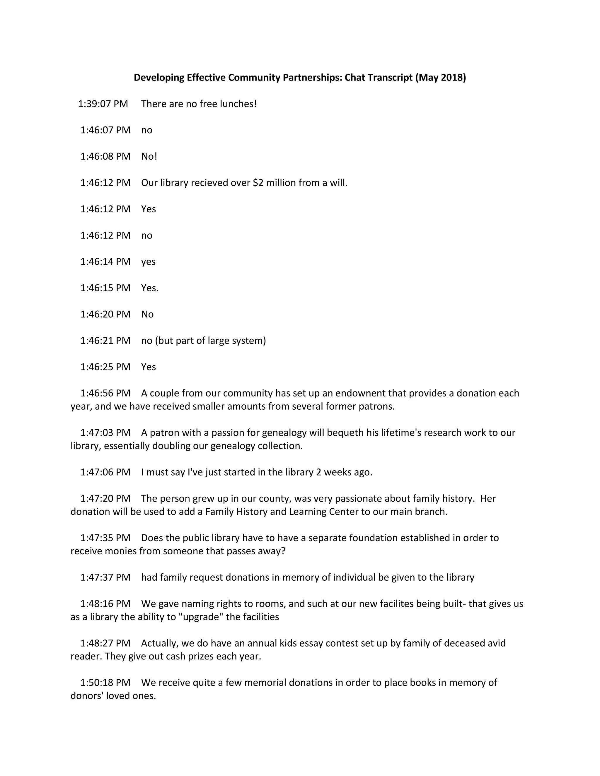 This document summarizes an online chat discussion about developing community partnerships for libraries. Participants shared many examples of successful partnerships their libraries have formed, including with schools, local businesses, government organizations, and community groups. Ideas discussed setting up memorial donations from patrons, partnering with job assistance non-profits, having sports teams visit for programs, and more. The discussion emphasized relationship-building and finding ways for partnerships to mutually benefit both the library and its community partners.