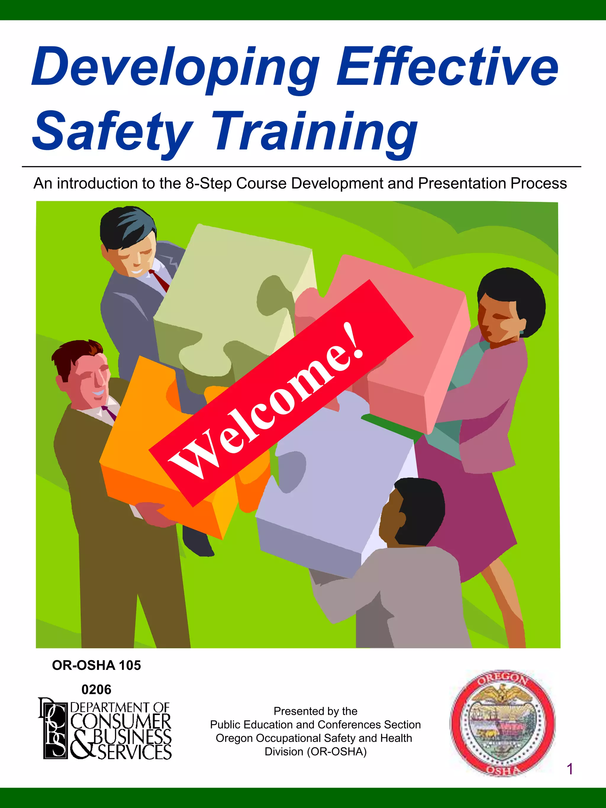 This document provides an overview of an 8-step process for developing and presenting effective safety training. The steps include: 1) assessing learner needs; 2) setting goals and objectives; 3) designing the curriculum; 4) selecting methods and media; 5) writing the course outline; 6) coordinating logistics; 7) presenting the training; and 8) documenting and evaluating the training. The overall goal is to help students improve their knowledge, skills, and ability to develop, present, and evaluate safety training outcomes.