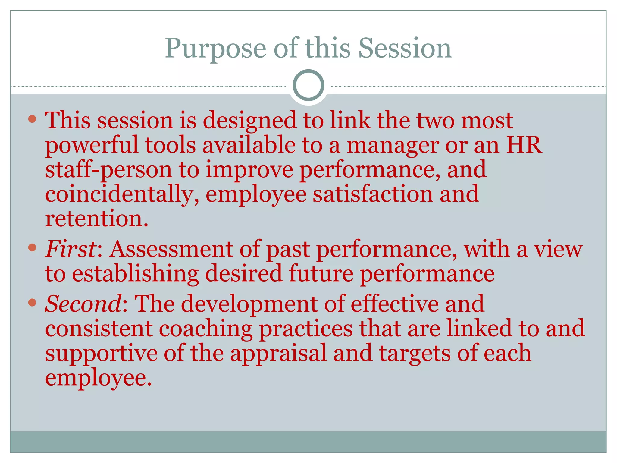 The document outlines a session aimed at enhancing employee and organizational performance through effective performance appraisals and coaching practices. It emphasizes the importance of aligning individual performance with organizational goals, continuous feedback, and development strategies to foster a high-performance culture. Key themes include the necessity of constructive coaching, team collaboration, and overcoming barriers to performance development.