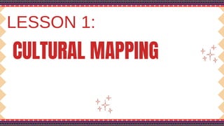 The document outlines a lesson plan on cultural mapping that has the objectives of discussing what cultural mapping is, explaining how to create a cultural map of one's community, creating a cultural map, and valuing one's cultural community; it discusses what cultural mapping is and why it is important; and it describes the stages of cultural mapping including planning, project design, implementation, synthesis, and finalizing the map.