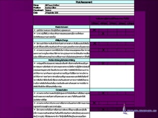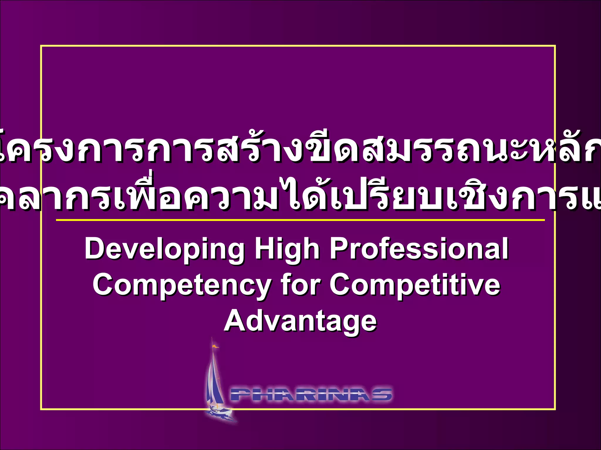 Developing high professional 1. 2. 3. การสร้างขีดสมรรถนะหลักของบุคลากรเพื่อความได้เปรียบเชิงการแข่งขัน (Developing High Professional Competency for Competitive Advantage) วัตถุประสงค์ของโครงการ การสร้างขีดสมรรถนะหลักของบุคลากรเพื่อความได้เปรียบเชิงการแข่งขัน “ Developing High Professional Competency for Competitive Advantage” เป็นการเสริมสร้างสมรรถนะ และจุดแข็งให้กับองค์กร โดยผ่านกระบวนการทางด้านการสร้างคุณค่าหลัก (Core Value) การกำหนดวัฒนธรรม (Corporate Culture) และการวัดขีดสมรรถนะหลักขององค์กรและบุคลากร (Competency) ซึ่งถือเป็นเครื่องมือและวิธีการสำคัญในการเชื่อมโยงระหว่างวิสัยทัศน์ เป้าหมาย (Goal) ธุรกิจหลัก (Core Business) ปรับให้เข้ากับกลยุทธ์ (Strategy) เพื่อสอดคล้องกับทิศทางและเป้าหมายในการดำเนินธุรกิจ และเสริมศักยภาพ สมรรถนะความได้เปรียบทางการแข่งขัน 4. ด้านค่านิยมร่วมและวัฒนธรรมองค์กร (Core Values and Corporate Culture) ค่านิยมร่วมขององค์กรสอดคล้องเหมาะสมกับกลยุทธ์ใหม่เพียงใด พฤติกรรมองค์กรโดยภาพรวมเหมาะสมกับค่านิยมหรือไม่ วัฒนธรรมการทำงานในปัจจุบันเอื้อหรือสนับสนุนต่อเป้าหมายหรือทิศทางใหม่หรือไม่ ด้านคุณลักษณะสมรรถนะของปัจเจกบุคคลและทีม (Individual Profile and Team Competence) ได้มีการระบุถึงขีดสมรรถนะที่เกี่ยวข้องในการทำงานหรือไม่ ได้มีการดึงเอาความสามารถพิเศษของทรัพยากรบุคคล จุดแข็ง จุดอ่อน สไตล์การทำงาน มาใช้ อย่างเหมาะสมหรือไม่ ผู้ที่มีผลงานดีเด่นได้รับการพิจารณาปรับเลื่อนอย่างเหมาะสมหรือไม่ องค์กรได้มีการดึงดูดและเอาใจใส่ดูแลบุคลากรที่มีคุณภาพหรือไม่ ผลงานของปัจเจกบุคคลและทีมในปัจจุบันมีความเหมาะสมหรือไม่ ด้านการสื่อสาร (Communication) กระบวนการสื่อสารในการทำงานระหว่างบุคคล หน่วยงานในองค์กรเป็นไปอย่างราบรื่นเพียงใด ข้อมูลที่ต้องการเผยแพร่ถูกส่งไปยังแหล่งที่ต้องการและทันตามเวลาอย่างเหมาะสมหรือไม่ 5. 6. การวิเคราะห์คุณสมบัติของพนักงาน (Personal Profile Analysis) จุดแข็งและจุดอ่อน การคัดเลือกโดยคำนึงถึงคุณลักษณะของงานและคุณสมบัติของพนักงาน จัดสรรตำแหน่งงาน (Recruitment) โดยคำนึงถึงขอบเขตของงานที่ทำ (Job Description) ในตำแหน่งที่รับผิดชอบ และการสนับสนุนให้มีการพัฒนาทางด้านอาชีพการงานที่ดีขึ้น (Career Path Development) 1. การพัฒนาบุคลากร (Human Development) การสร้างความได้เปรียบเชิงการแข่งขัน (Creating Competitive Advantage) 7. 8. 2. การพัฒนาทีมงาน ( Teamwork Development ) Team Work Analysis Teamwork Analysis Management Team การสร้างทีมงาน เน้นการวิเคราะห์ หาสไตล์ความเป็นผู้นำที่มีความเหมาะสมกับทีมงานตามตำแหน่งและหน้าที่ ความสัมพันธ์ระหว่างบุคคล ( ผู้นำและผู้ตาม ) ในการทำงานเป็นทีม (Interrelationship) และความนับถือที่มีต่อผู้ร่วมงาน การวิเคราะห์ทีมงาน (Teamwork Analysis) ช่วยให้ทราบถึงการพัฒนาของทีมง