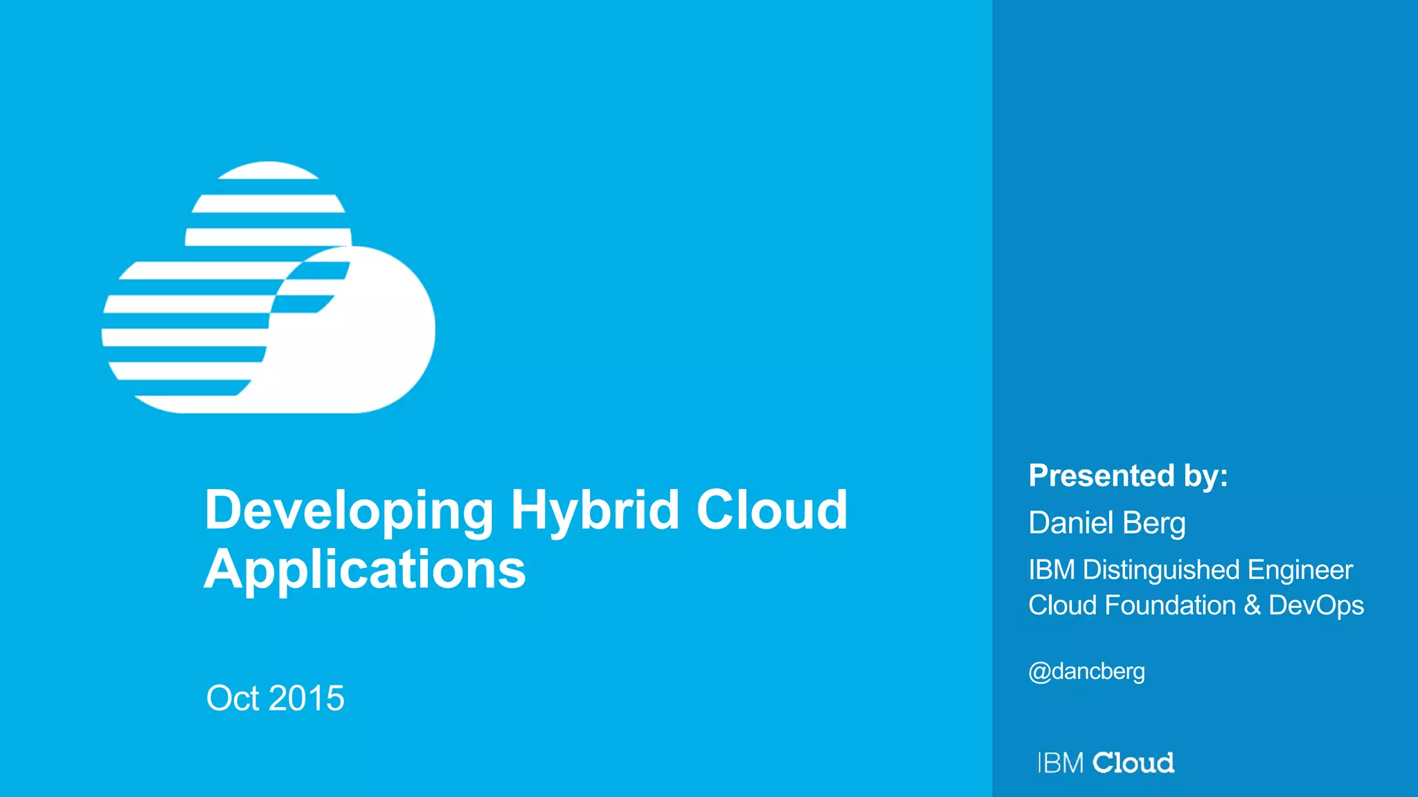 This document discusses developing hybrid cloud applications. It notes that cloud is enabling digital disruption and rapid innovation. It then discusses challenges around balancing investments in innovation and optimization. It outlines the evolution from traditional on-premises infrastructure to cloud-based platforms and services. It also summarizes strategies for using hybrid cloud to reduce costs while enabling innovation through new applications and integration with existing IT.