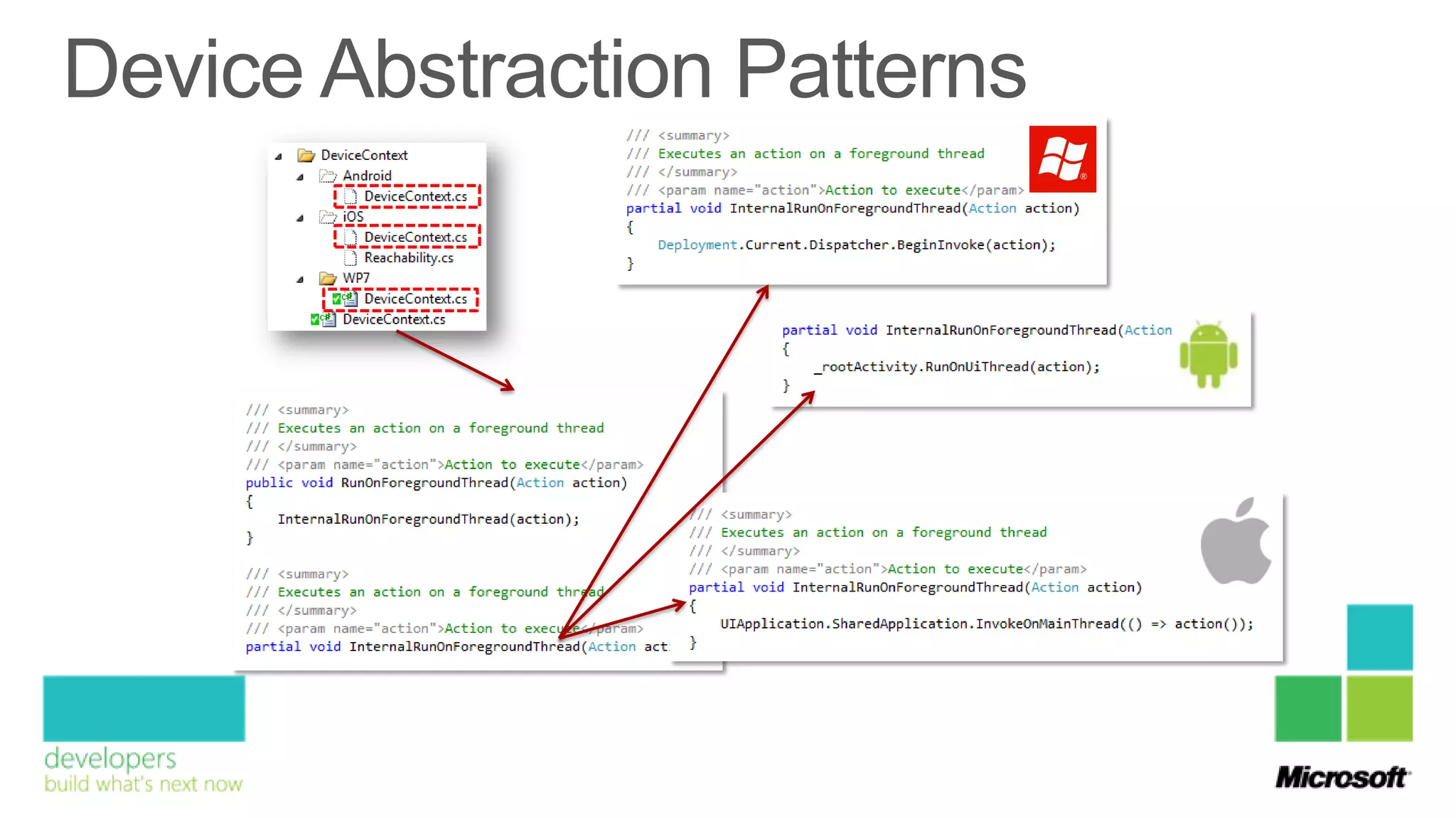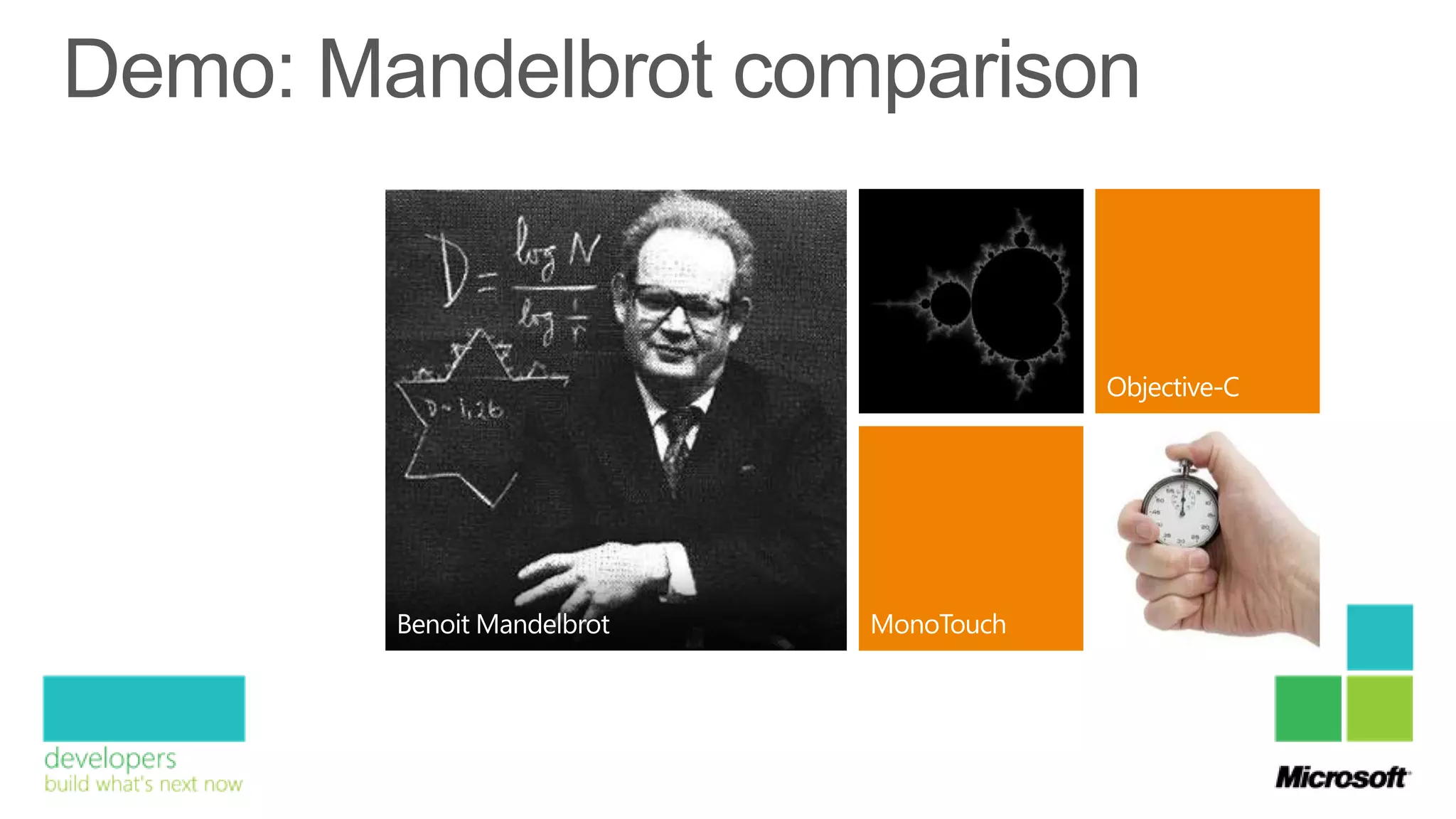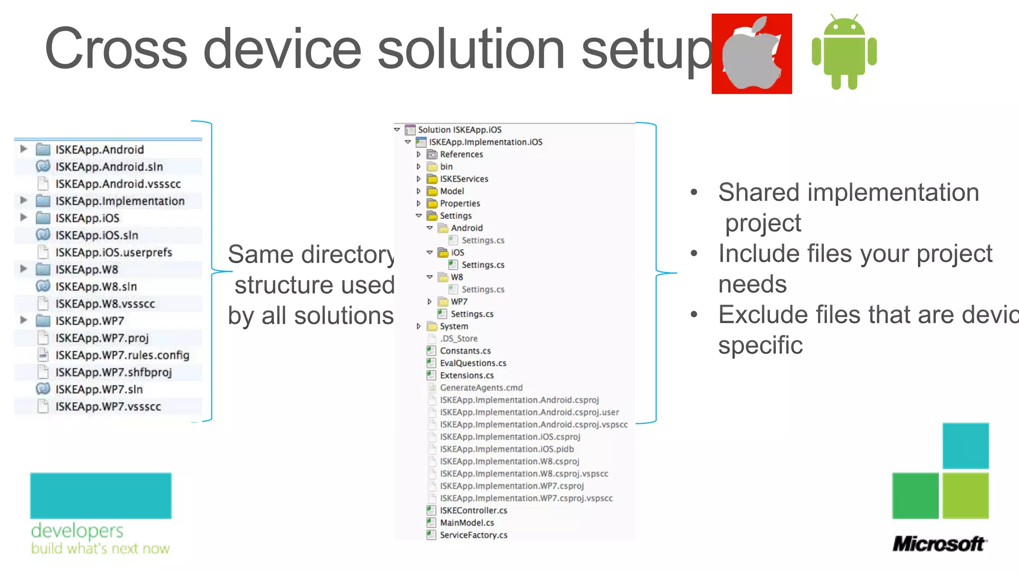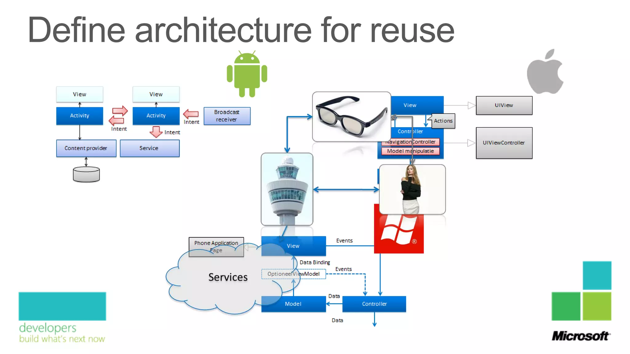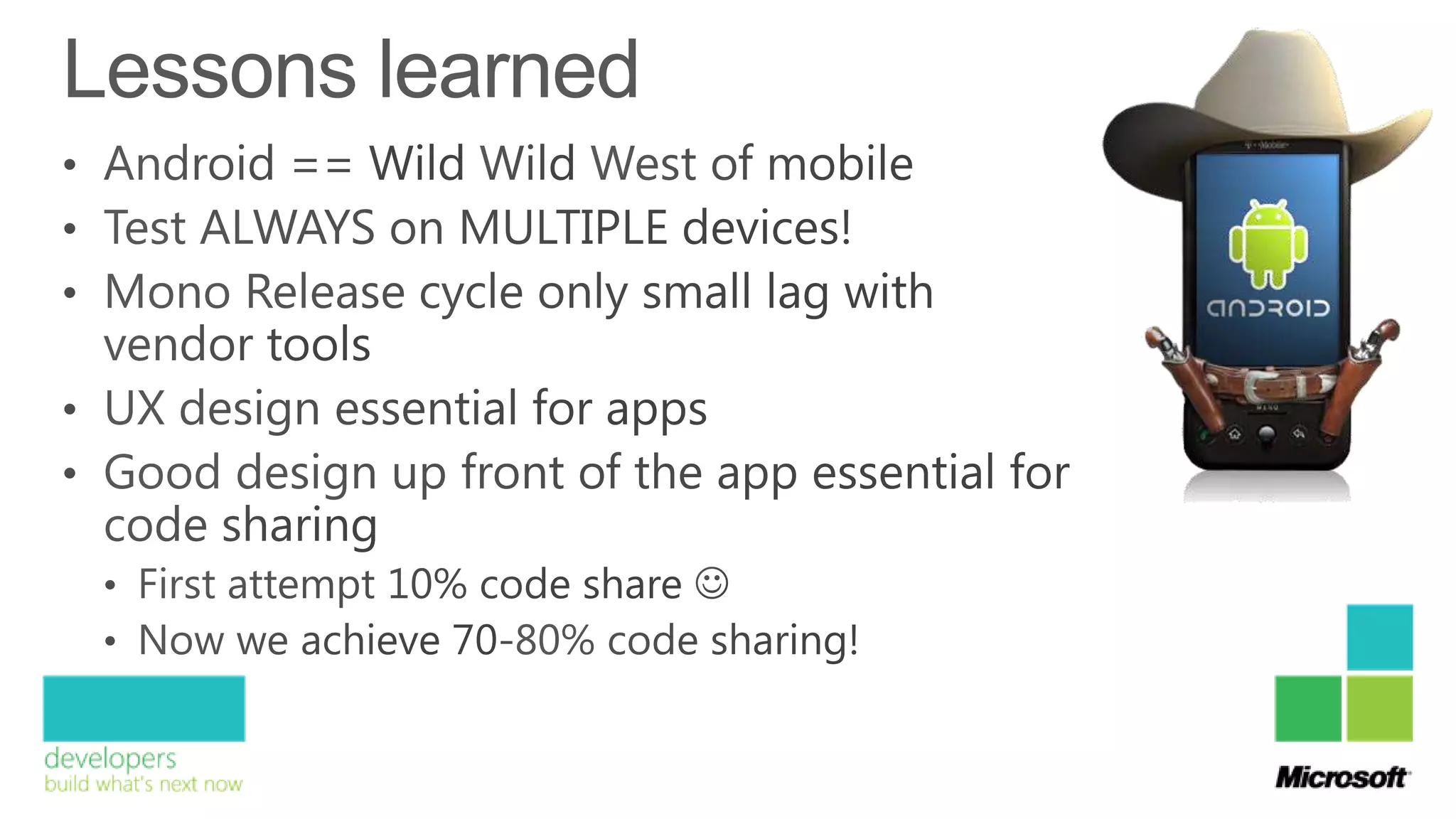 The document discusses the development of cross-platform mobile applications for iPhone, Android, and Windows Phone, emphasizing various technologies and programming languages used, such as C#, Java, and HTML5. It also covers the architecture and shared logic versus platform-specific services for each operating system. Key figures mentioned include Willem Marcel, Meints de Vries, and Roy Cornelissen, along with their roles in technology management and architectural design.