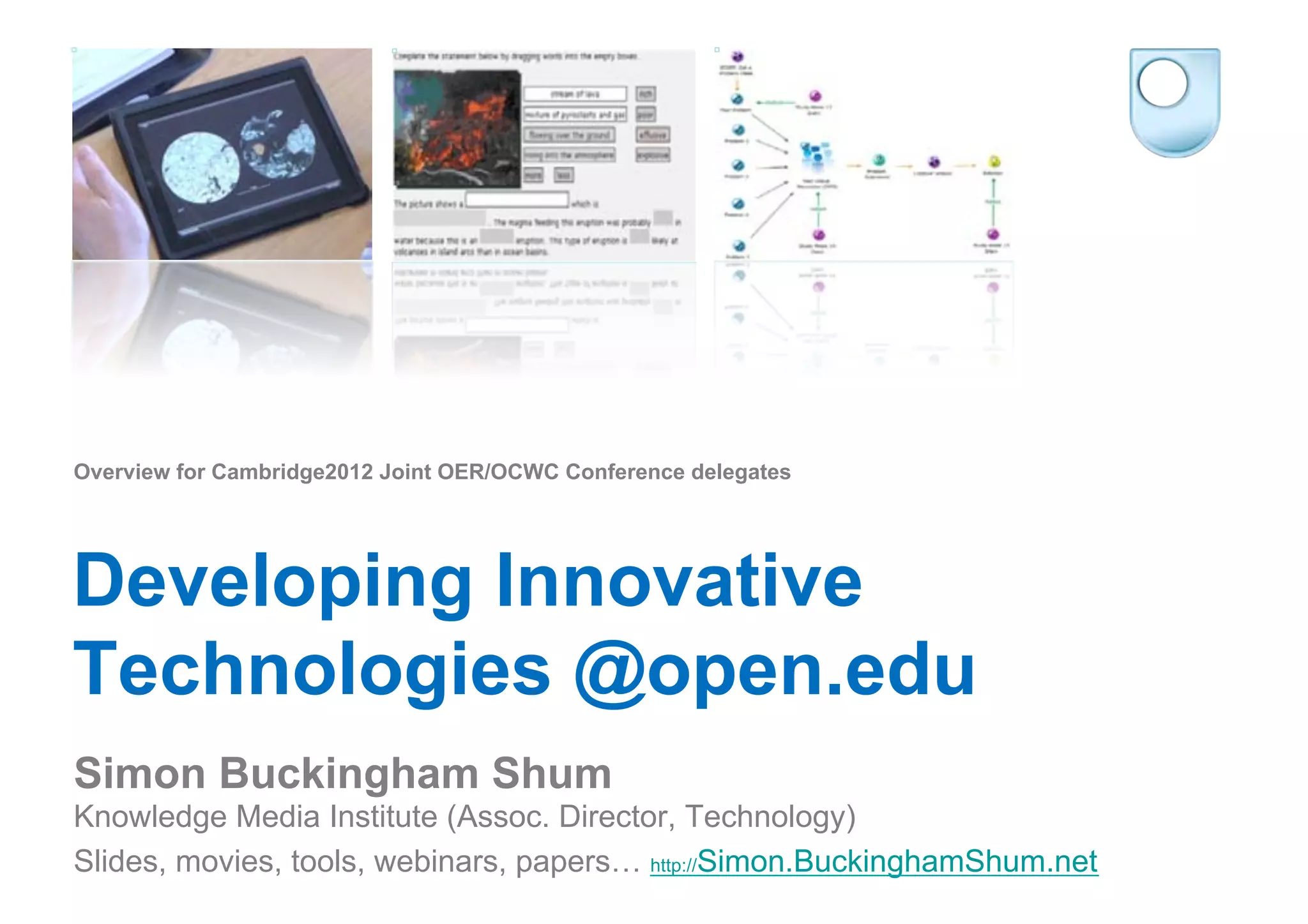 This document provides an overview of learning technology innovation at the Open University. It describes how the OU's Knowledge Media Institute and other departments collaborate to develop new technologies through internal networks and international partnerships. Examples are given of technologies developed over the past 30 years for distance education, including early uses of simulations, voice over phone networks, and synchronous collaboration tools. Current areas of work discussed include intelligent tutoring systems, argument mapping, social learning platforms, and learning analytics.