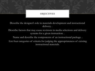 This document discusses developing instructional materials. It describes the designer's role in materials development and instructional delivery. When the designer is also the instructor, they design, develop and deliver the materials themselves. When they are not the instructor, the designer works with a team that may include managers, subject matter experts, materials developers and evaluators. The document also discusses factors that influence media selection, the components of an instructional package including materials, assessments and course information, and strategies for materials development like rough drafts, rapid prototyping and using tools and resources.