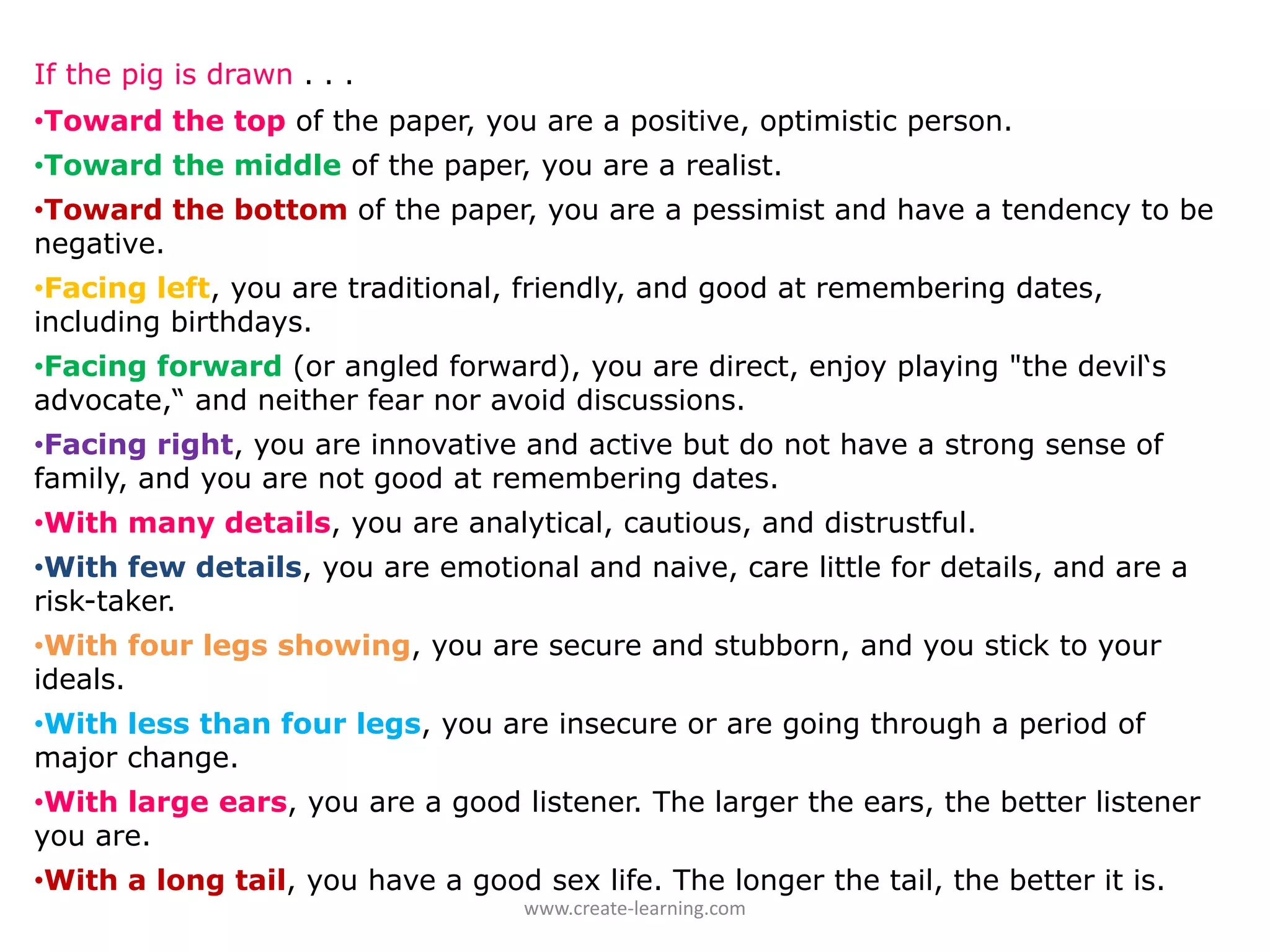 The document presents various personality traits based on how a pig is drawn, linking positions and details of the drawing to characteristics of optimism, realism, and more. It also discusses team dynamics, the importance of distinguishing hard and soft skills, and effective team leadership strategies. Additionally, it emphasizes the significance of commitment, morale, and individual strengths within a team setting.