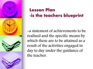The document discusses lesson planning and provides guidance on developing effective lesson plans. It covers: