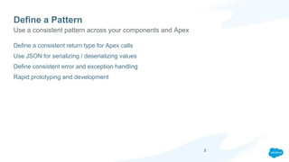 The document provides guidelines and best practices for developing components for Salesforce communities, focusing on standard patterns, error handling, and optimization for admin configuration. It emphasizes the use of abstract components to improve code maintainability and offers insights into debugging methods and SEO enhancements. Additionally, it lists community development sessions and resources for developers to further their skills in this area.